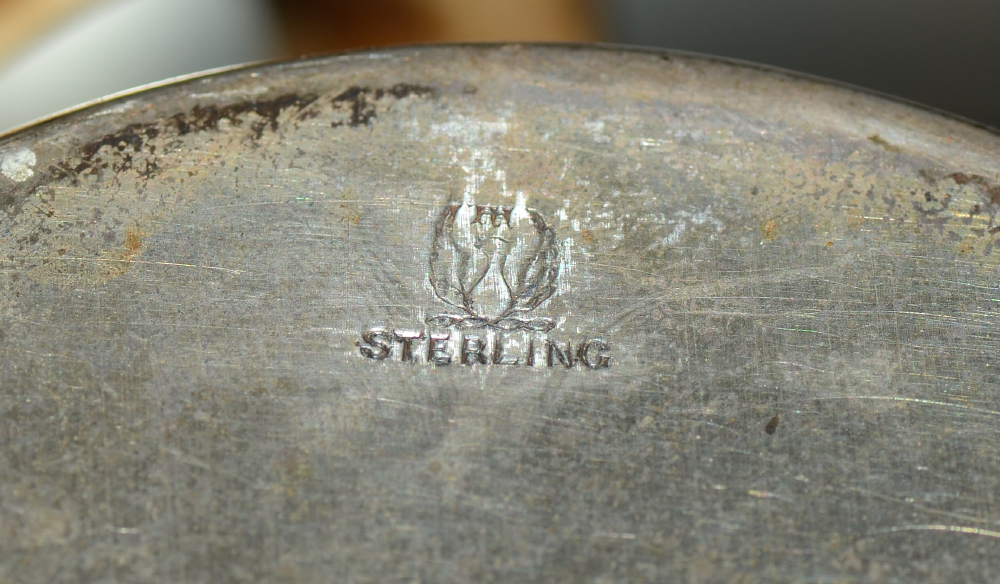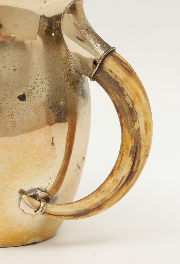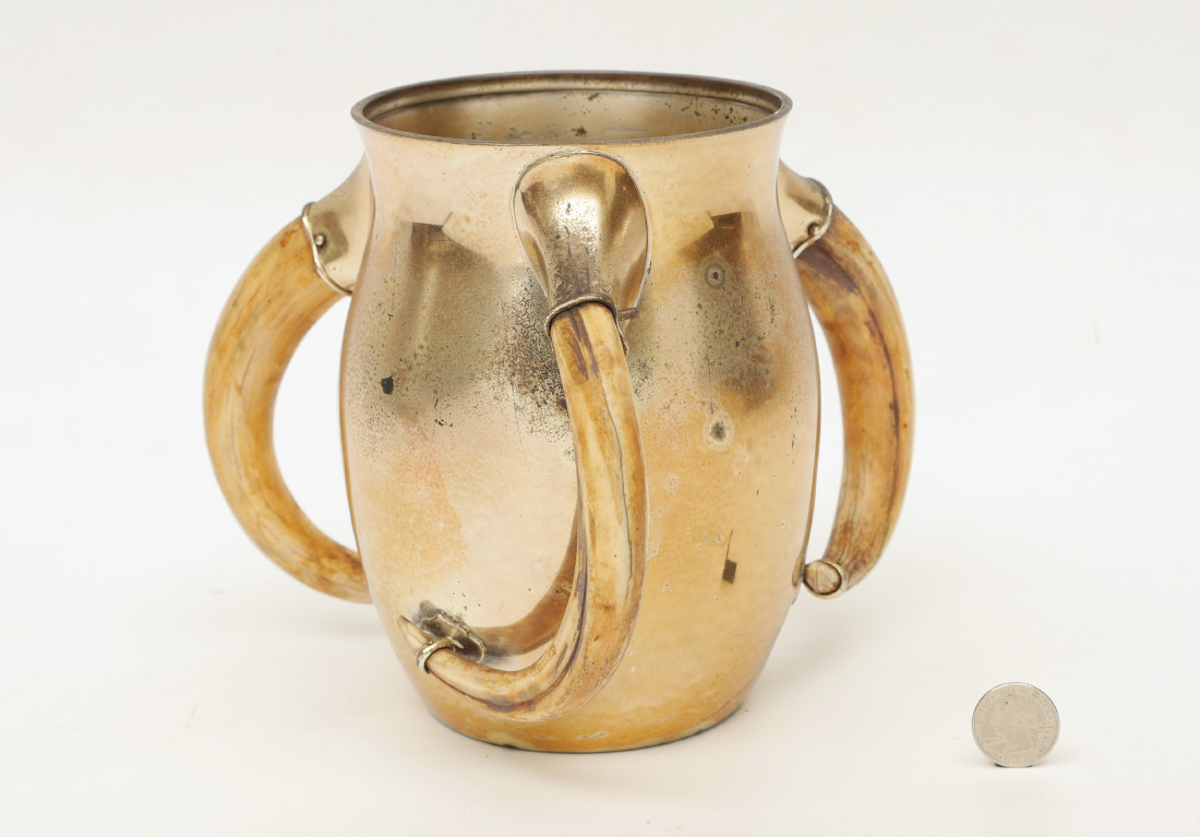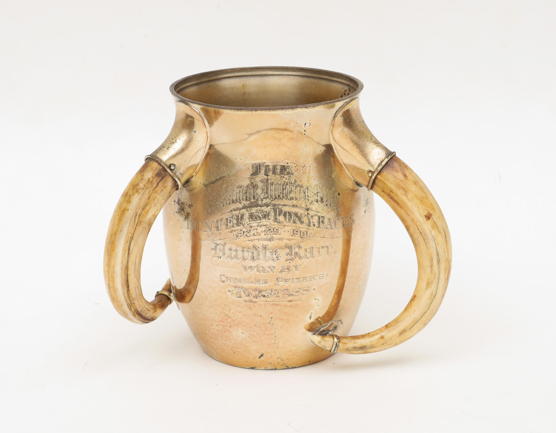 ROCKAWAY HUNTING CLUB STERLING PRESENTATION TROPHY: 1905 Meriden Brittania Co. presentation trophy with 3 mounted boar tusk handles, vermeil gold plated finish. Presentation reads ''The Rockaway Hunt Club Hunter and Pony Races, April-29-1905, Hurdle Race Won By Charles Pfizer's Trespass''. Overall measures 7'' h. x 8 3/4'', approx. 26.7 troy oz. inclusive with tusks.