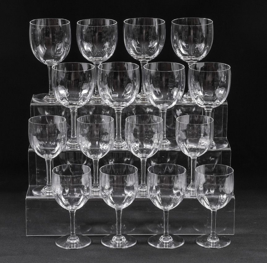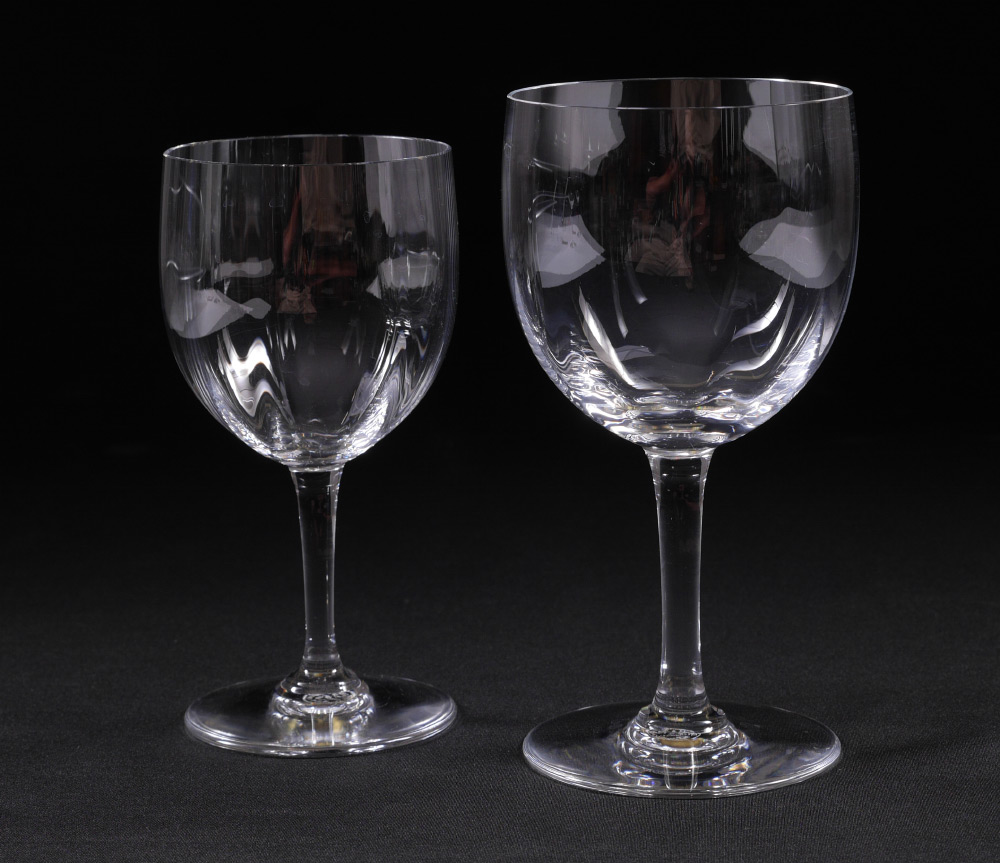 16 BACCARAT MONTAIGNE OPTIC CRYSTAL STEMS: 16 piece total in the Montaigne pattern by Baccarat Crystal to include 8 water 6 3/8'', 8 wine claret 5 3/4'', 2 original boxes which hold 6 of each. Larger box measures 9'' h x 15 1/2'' x 10 1/2''.