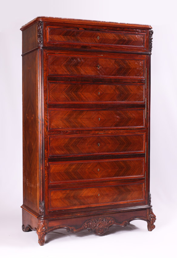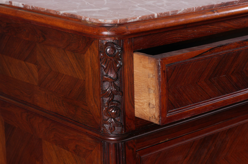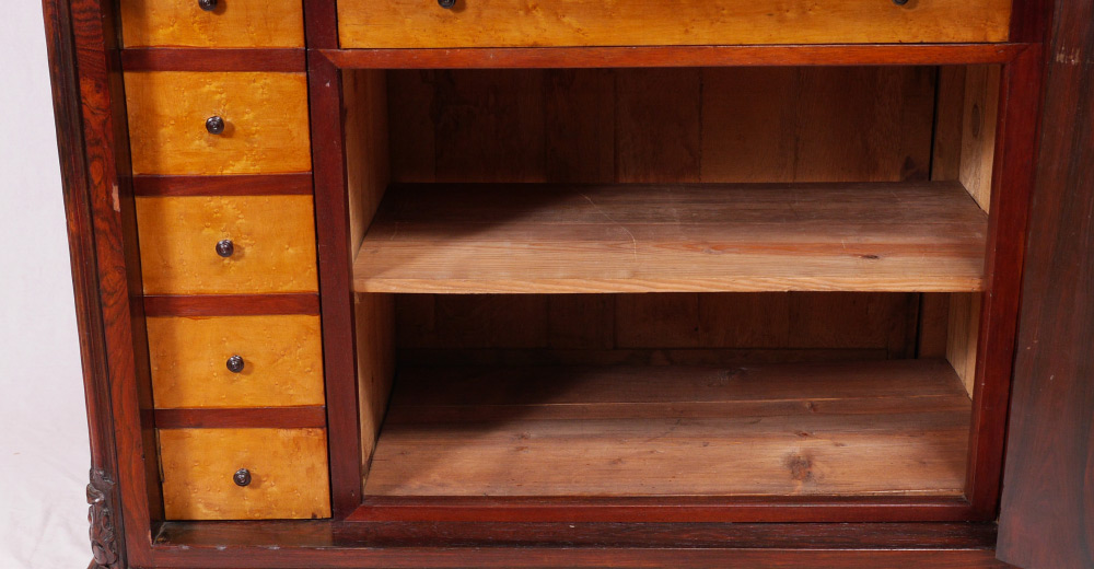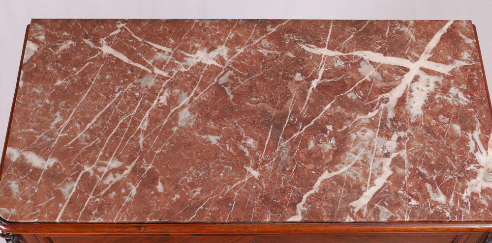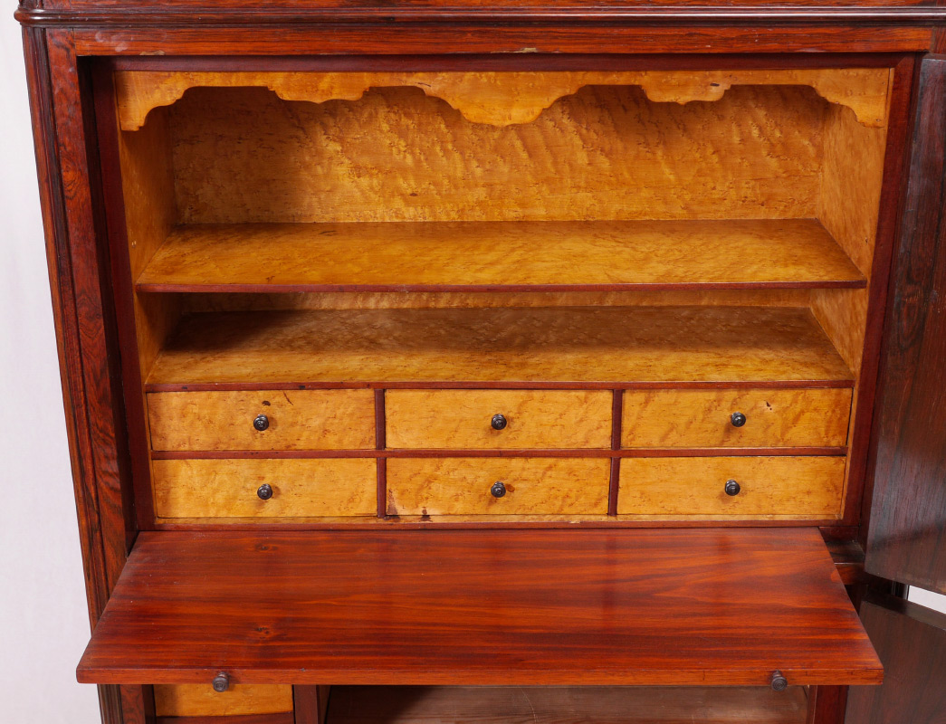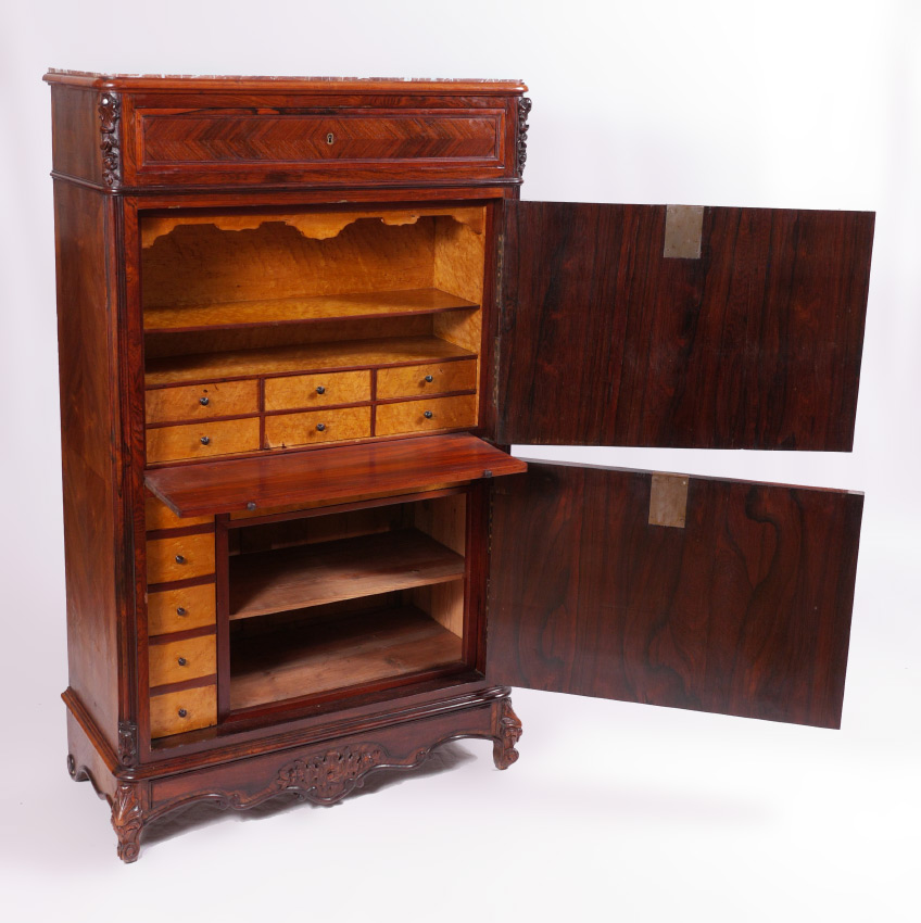 MARBLE TOP ENGLISH ROSEWOOD SECRETARY ABATTANT: Pink variegated inset marble top over single drawer. 2 door front with false appearance of drawers, top door opens to bird's eye maple veneer interior, single shelf over 6 drawers, rosewood writing surface. Lower door opens to drawers with bird's eye maple fronts, unfinished shelf and storage. Carved front feet and skirt. Overall measures 62 1/2'' h. x 38'' x 18 3/4''.