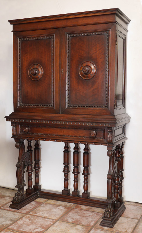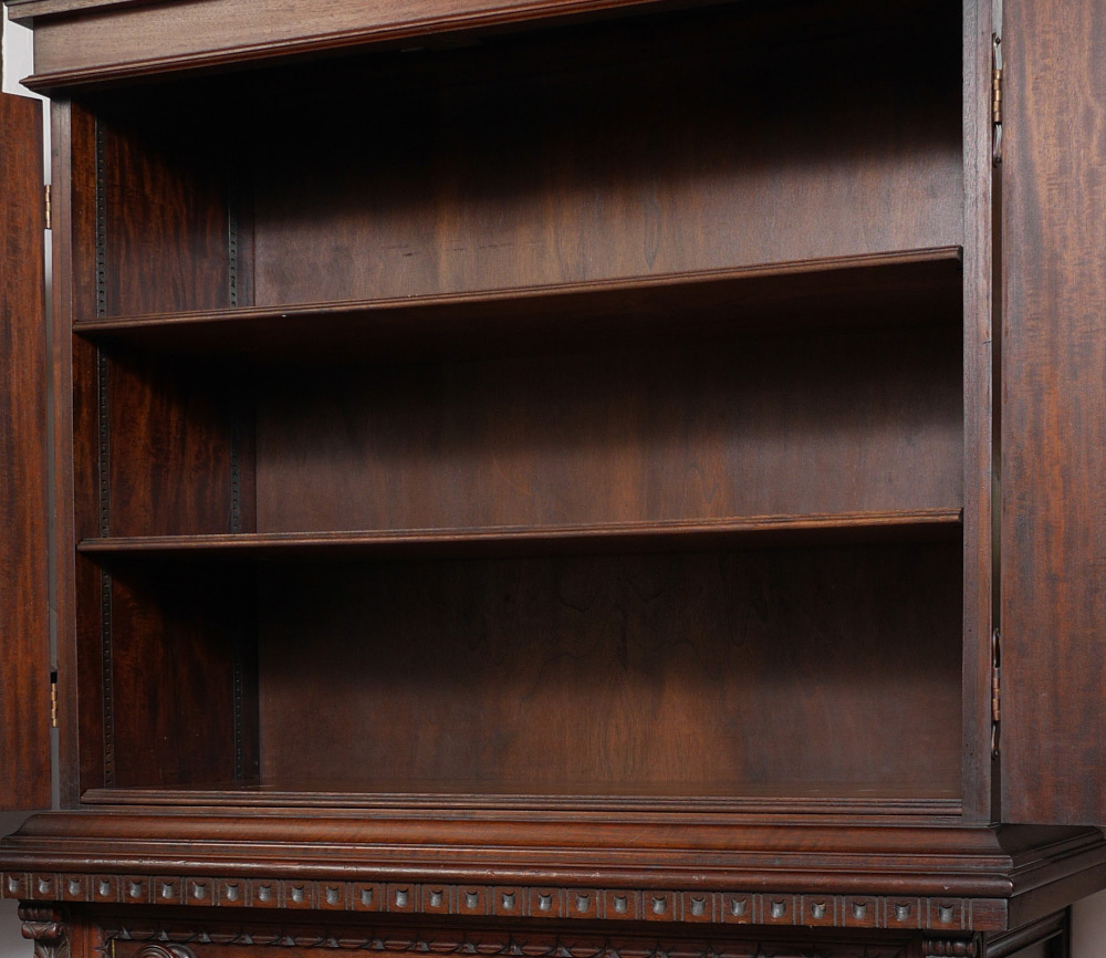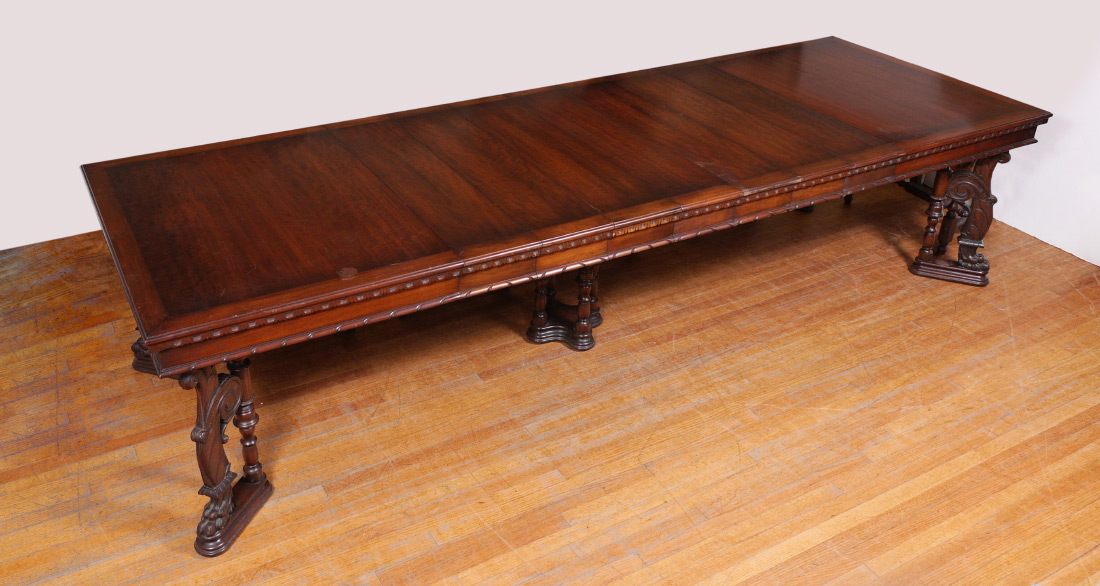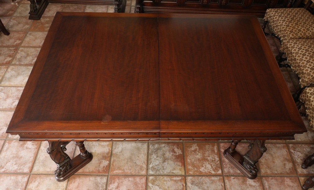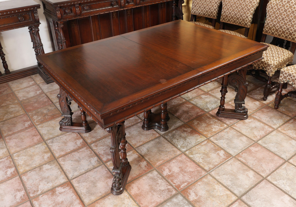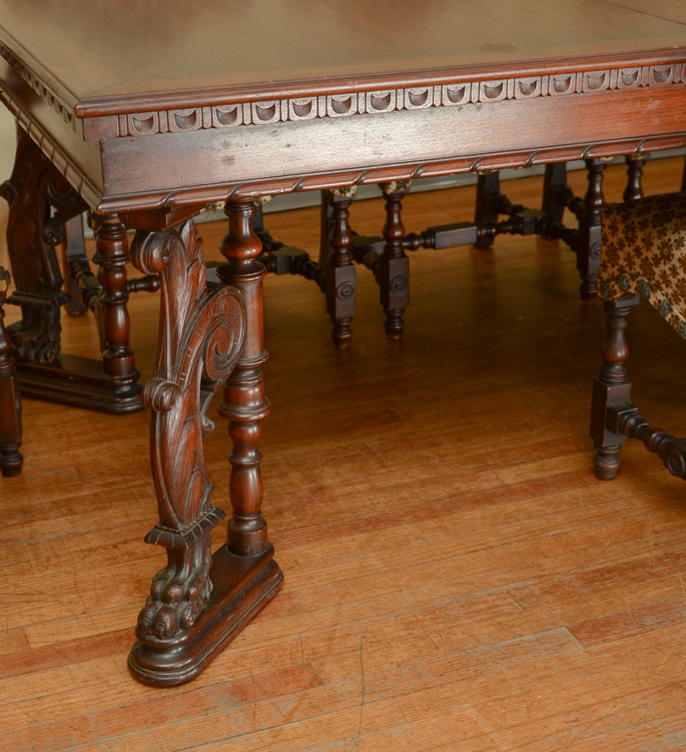 MAJOR THOMAS BAYLESS CENTURY FURNITURE CARVED DINING ROOM SUITE: Gothic revival style by Century Furniture. 14 piece set to include, TABLE with carved foliate scroll and paw feet legs, turned column center support, 31'' h. x 66'' x 46''. Plus 7 leaves each 9.75'' wide. When fully assembled table measures 11'2''l. Set of 12 CHAIRS with upholstered seats, two arm 47.75''h. x 27'' x 18'' and 10 side chairs, 41.5'' h. x 20.75'' x 22''. And blind front CHINA HUTCH cabinet, upper section with dual solid doors hiding a shelved interior, base with single full length drawer, carved foliate scroll and paw feet supports to front and spool turned supports to sides and back, 66 1/2'' h. x 40 1/4'' x 18''. 14 pieces sold as a set. Thomas Bayless Estate.