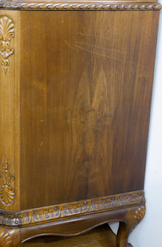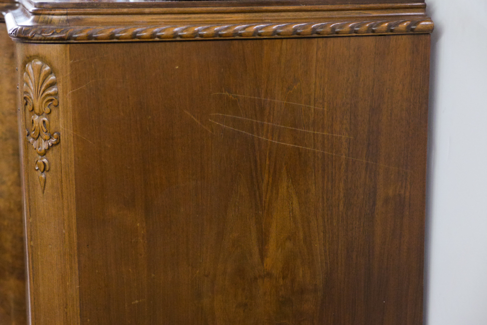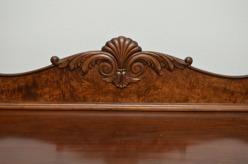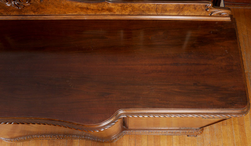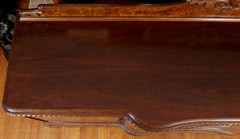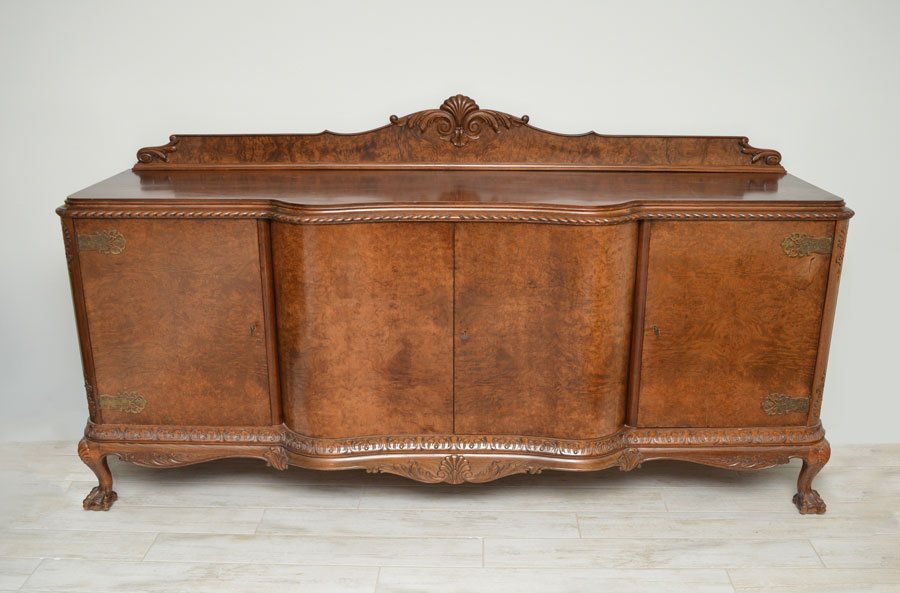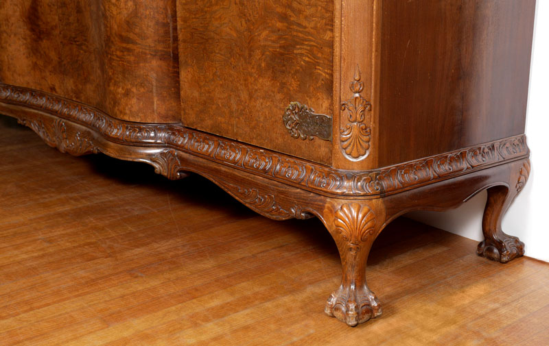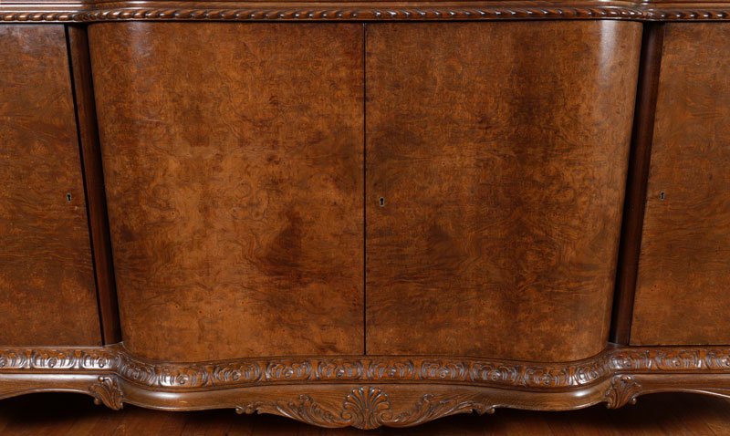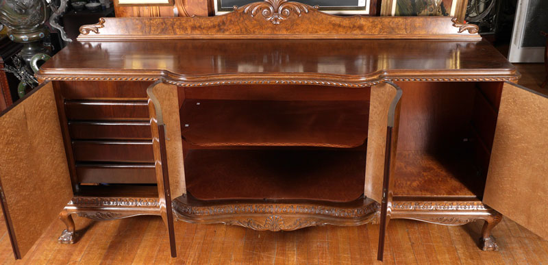 RICHLY GRAINED BURLED WALNUT SIDEBOARD: Cabinet with gadroon edging, acanthus leaf carvings on the cabriole legs, and carved paw feet, generously proportioned with linen and silver drawers, 49 1/4'' h. including backsplash x 92'' x 25''.