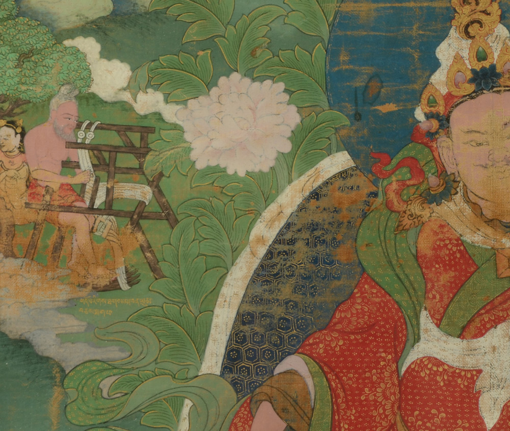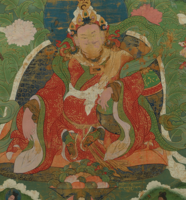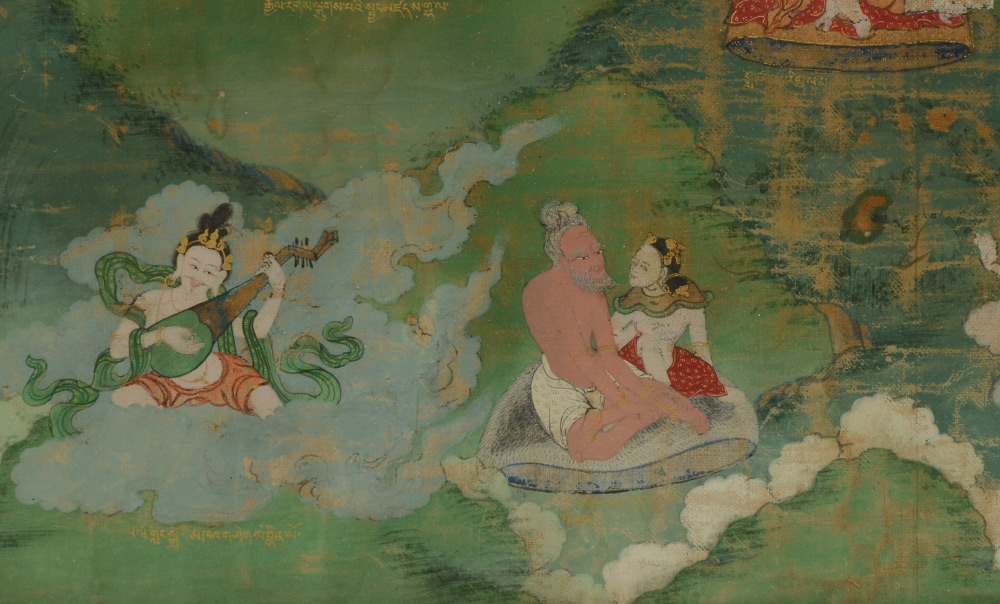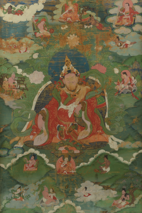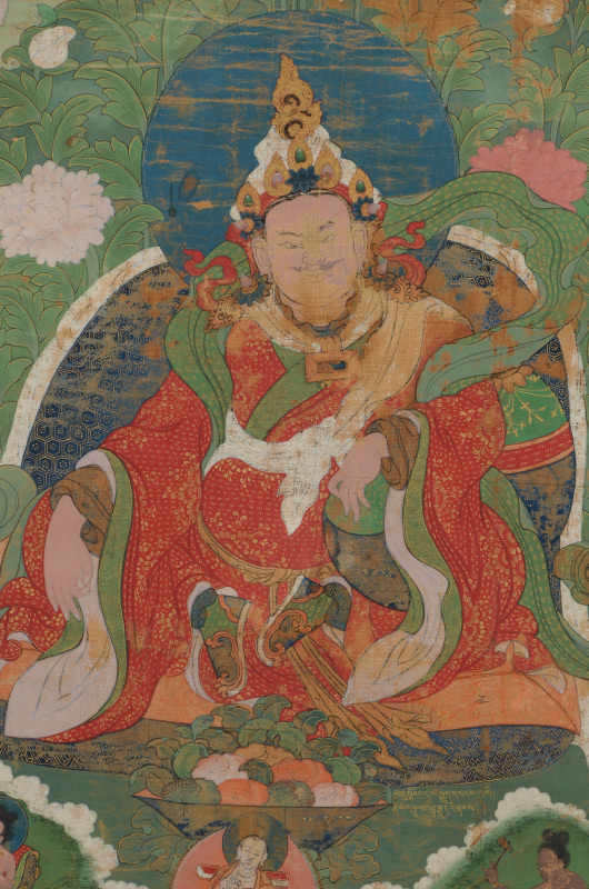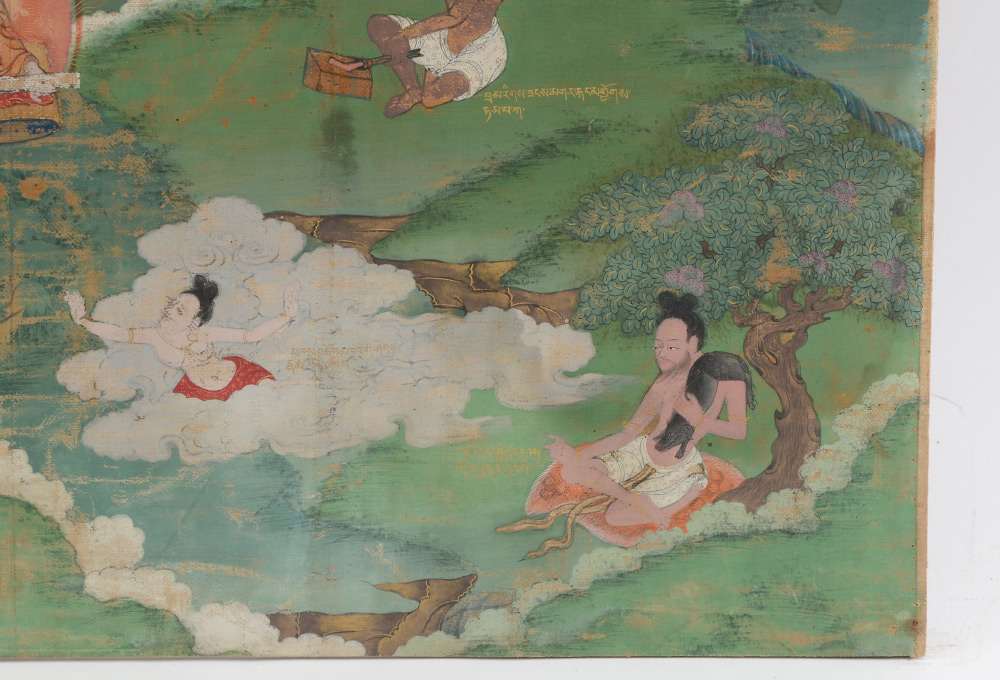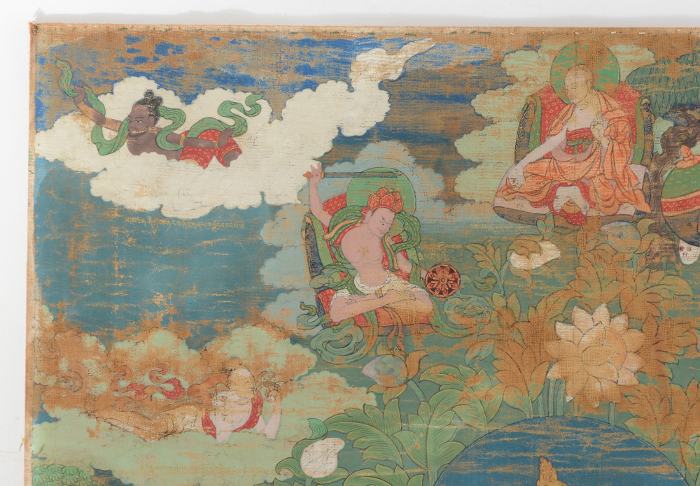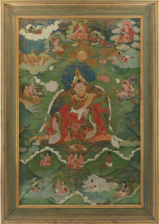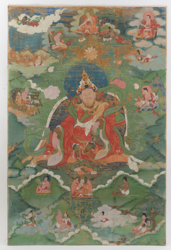 GOOD EARLY TIBETAN THANGKA PAINTING: Predominantly Green Background Featuring Main Deity in Center with Surrounding Smaller Deities, Oil/Canvas sewn in upper margin to cardboard, Size 30'' x 20'', custom painted and gilded contemporary frame, 36'' x 26''.