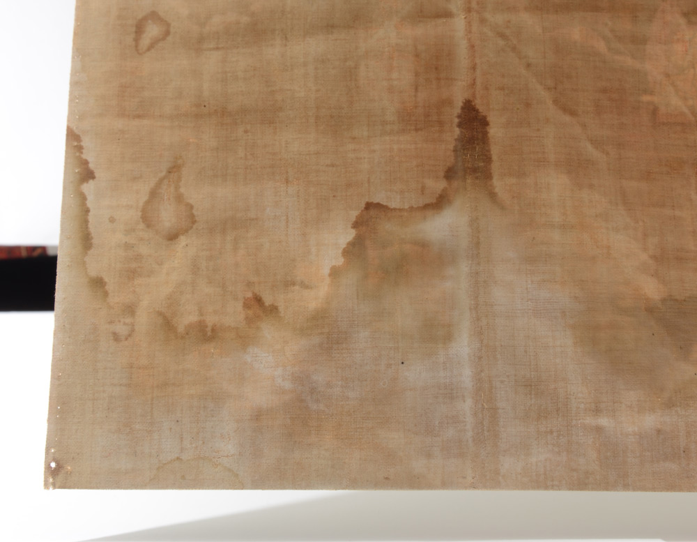 CONDITION: Visible loss from rolling, some water damage in lower margin, sewn in upper margin, frame has minor wear, sold as is.