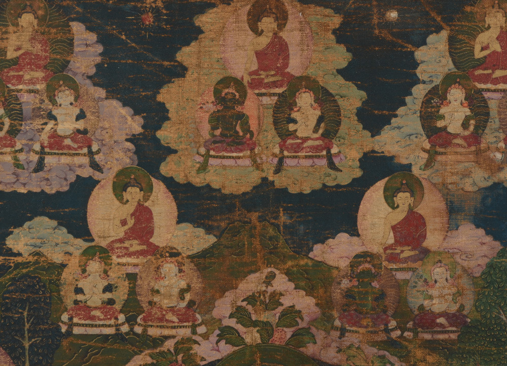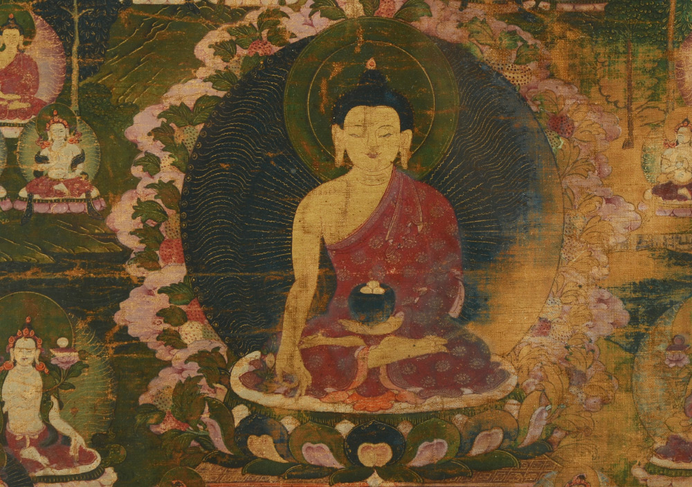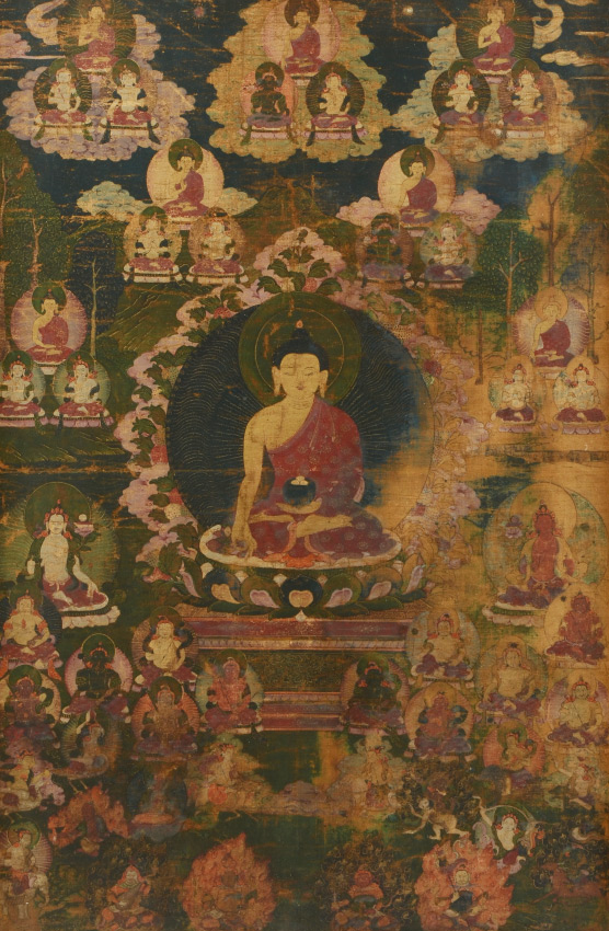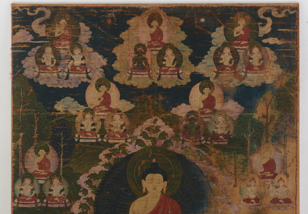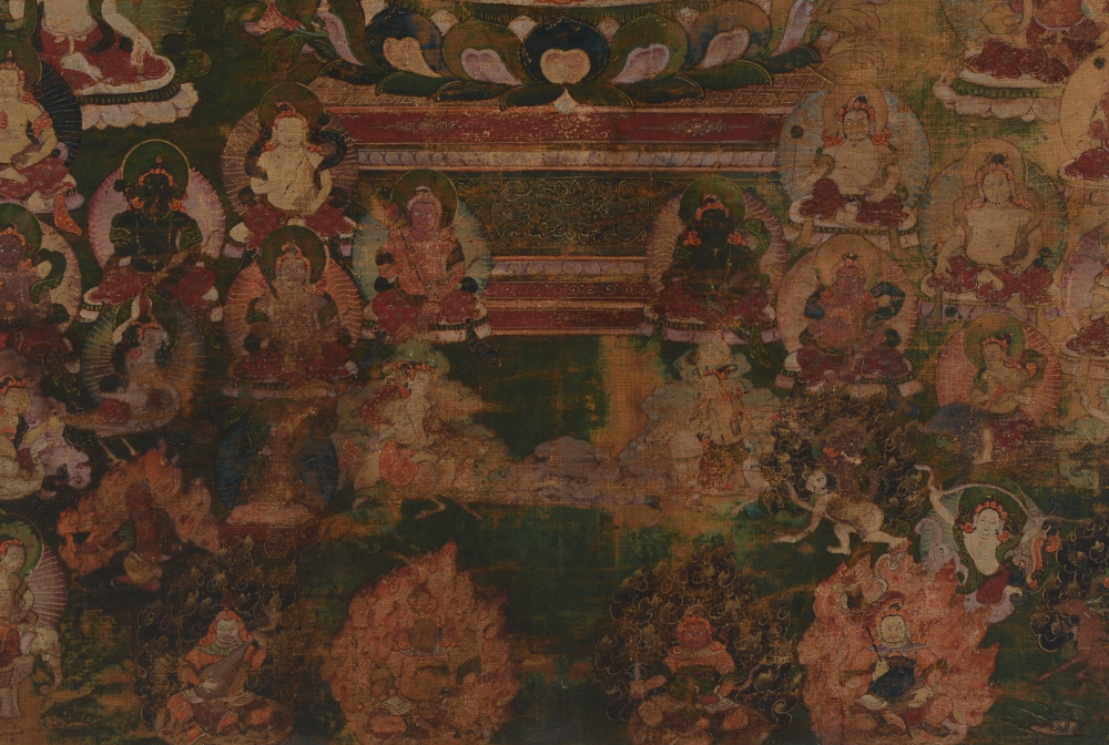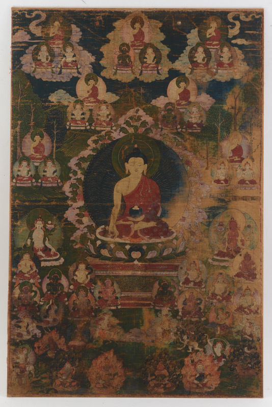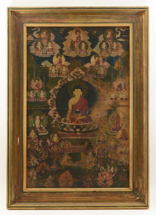 EARLY TIBETAN THANGKA PAINTING: Central Figure Surrounded by Many Other Figures throughout the Image Along with Mortals, Oil/Fabric, sight size 24.5'' x 15.75'', framed, 30.5'' x 21.75''.