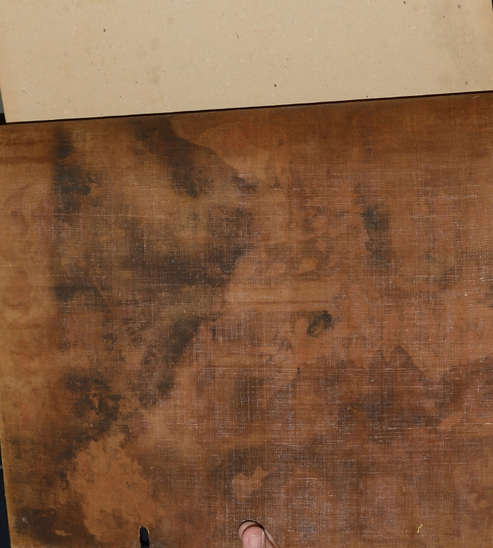 CONDITION: Visible staining and loss from rolling, small fingerprint size loss in bottom margin, darkening/staining verso, possible water staining, frame shows wear, sewn to cardboard in top margin, sold as is.