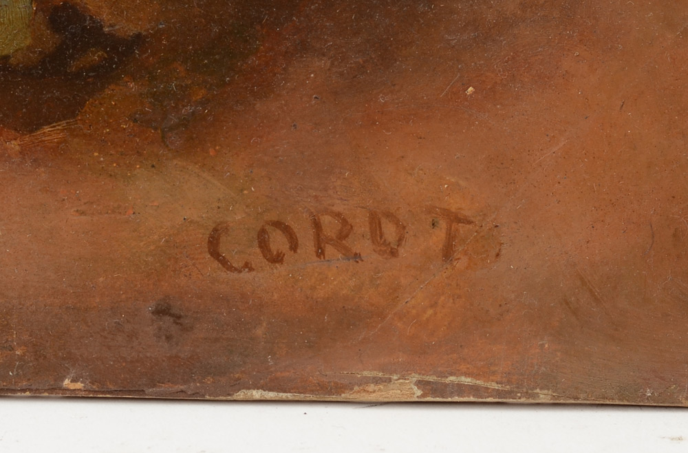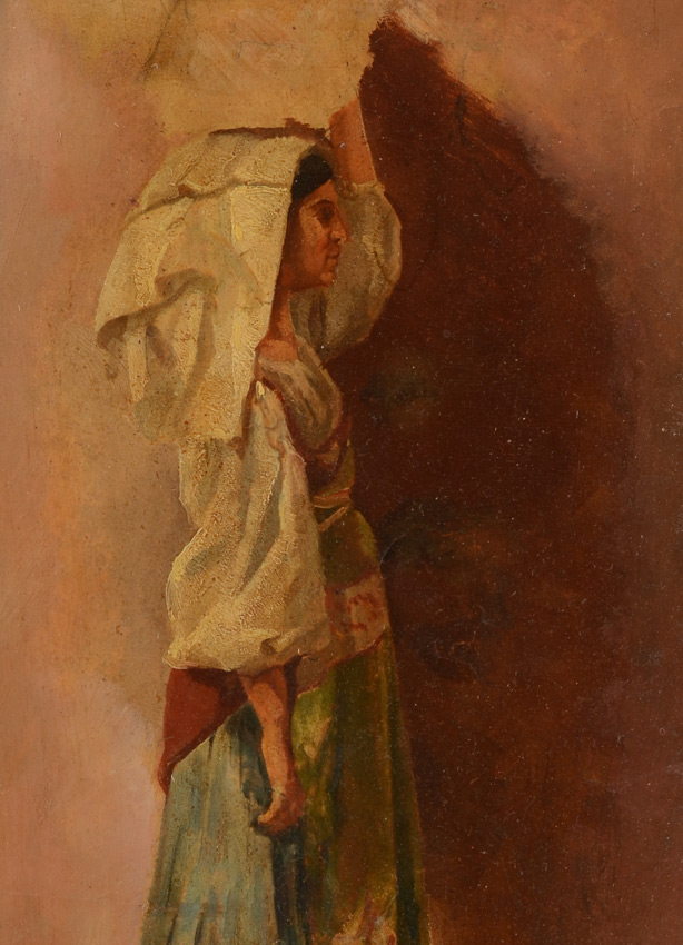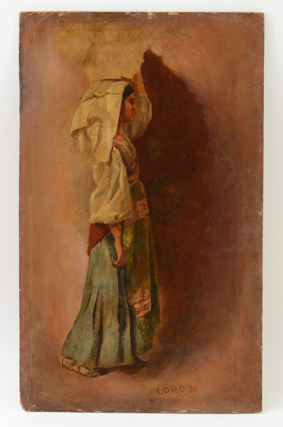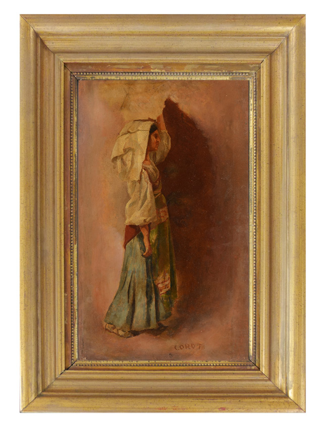 ITALIAN PEASANT GIRL PAINTING SIGNED COROT: Full length portrait of Italian Peasant Girl, Oil/Paper/Board, 15.5'' x 9.5'', signed lower right, contemporary frame, 20.5'' x 14.5''.