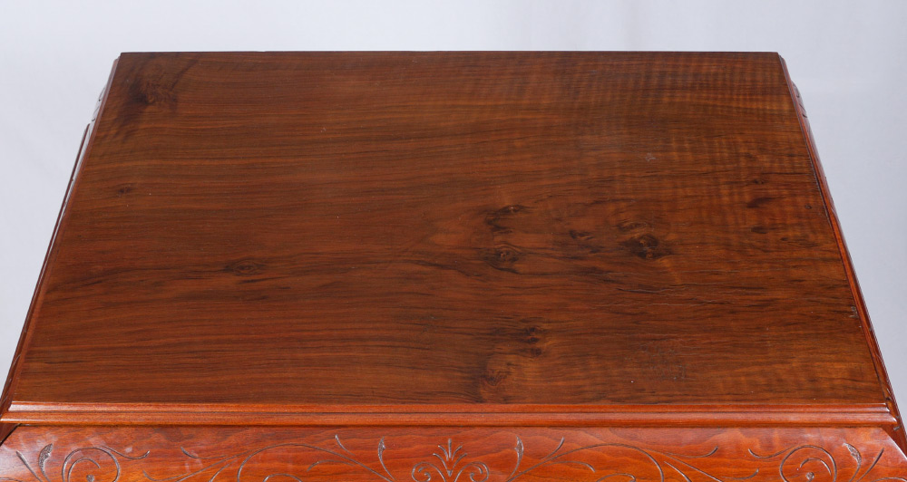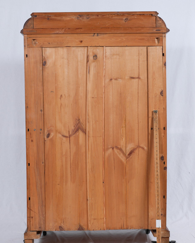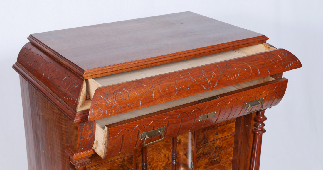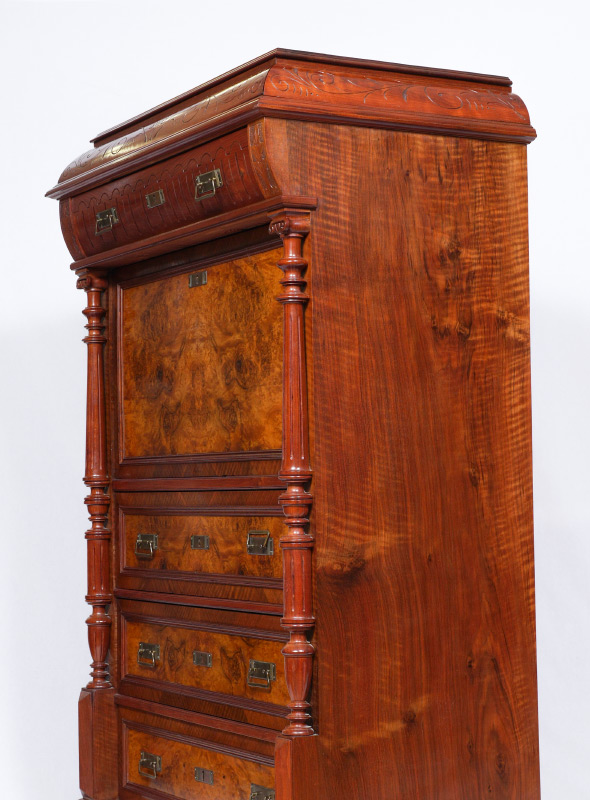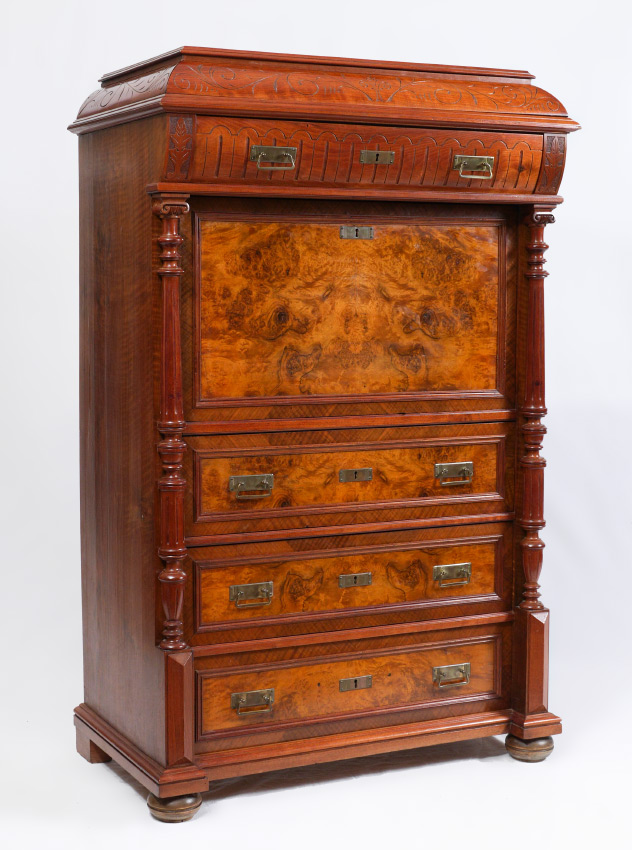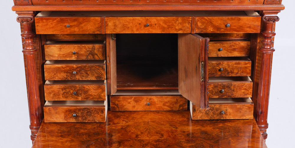 CONTINENTAL DROP FRONT SECRETARY: 20th century construction, top with carved trim and a secret drawer over a full length drawer with shaped front. Drop front opens to burl wood veneer interior with 11 drawers and door, over 3 full length drawers. Burl veneer panels on drawers and drop front, turned and fluted columns. 58 3/4'' h. x 37'' x 21''.
