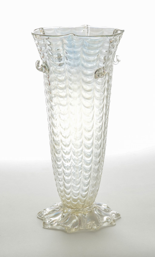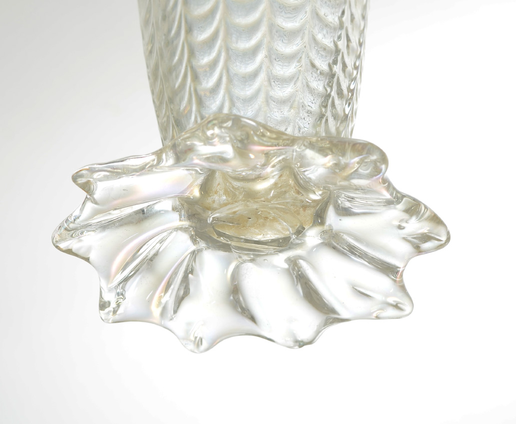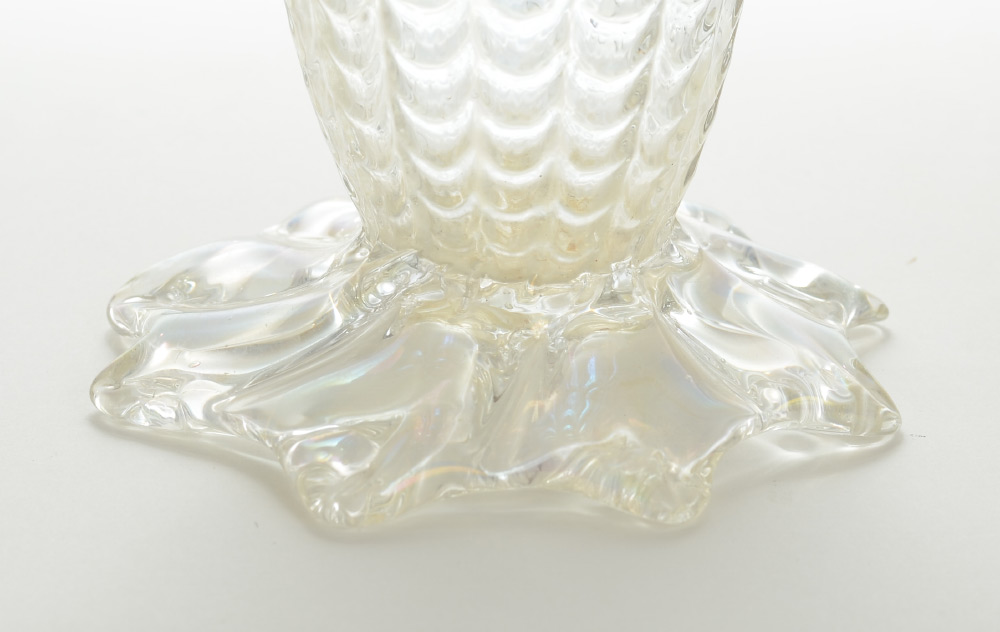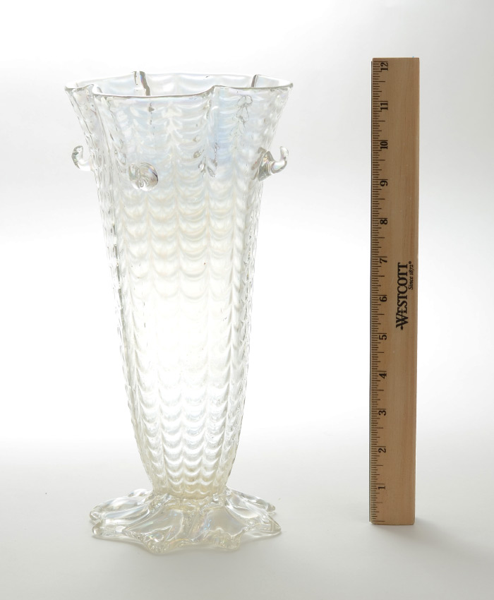 AUSTRIAN RUFFLED ART GLASS VASE: Attributed Loetz, quatrefoil rim, ribbed sides with fish scale design, applied ''hooks'', shaped base, slight iridescence to clear glass. Unmarked, overall 11 1/2'' h. x 6''.