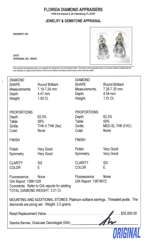 3CTW DIAMOND STUD EARRINGS: Simple and Elegant 3.0CTW Diamond Stud Earrings, Clarity SI2 and Color E. Weight 2.5 grams. Threaded posts. Sold with current Florida Diamond Appraisers GIA graduates appraisal for $35,000