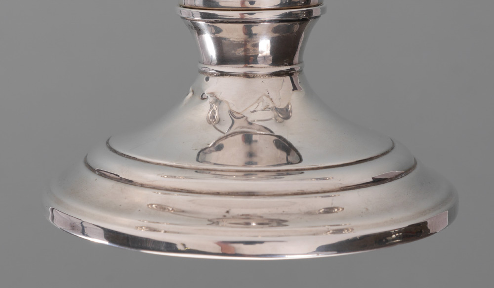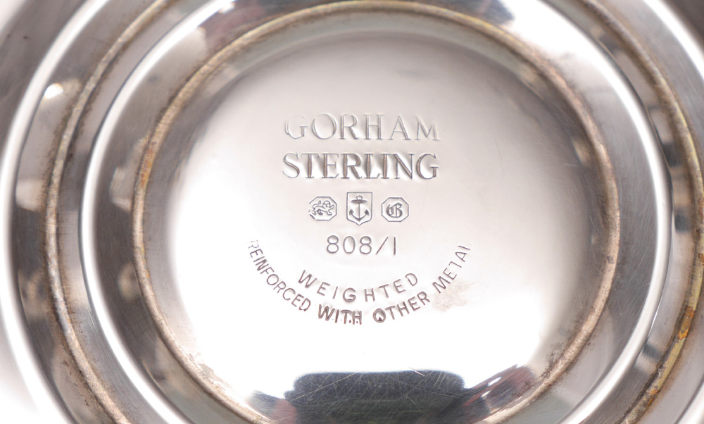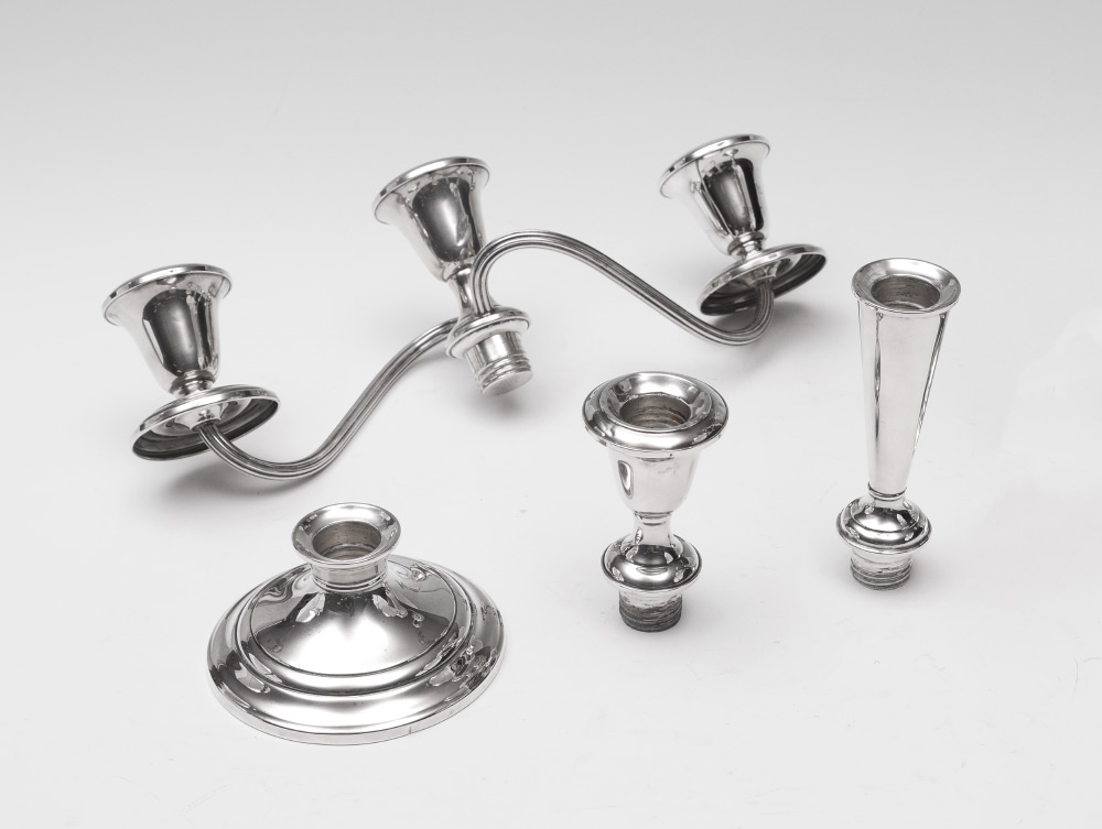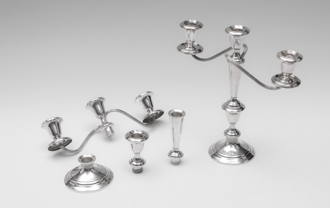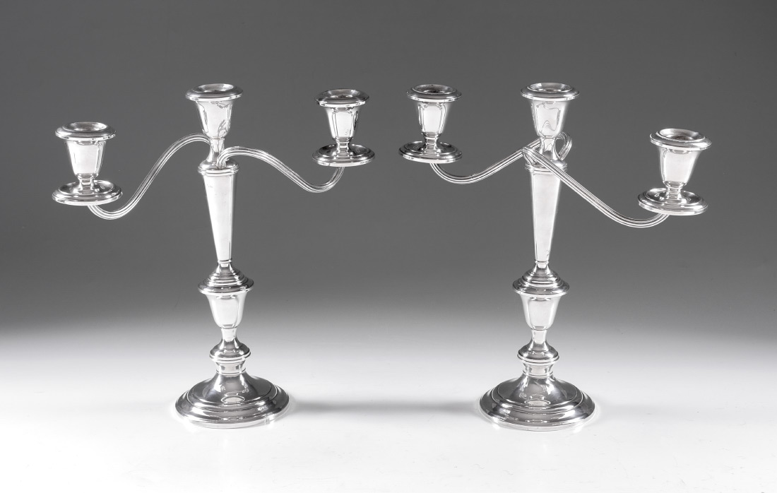 PAIR GORHAM STERLING CANDELABRA: Weighted sterling base, 3 light converts to single light, well marked on base, each candelabrum with four interlocking parts, 11 1/2'' h. x 12''.