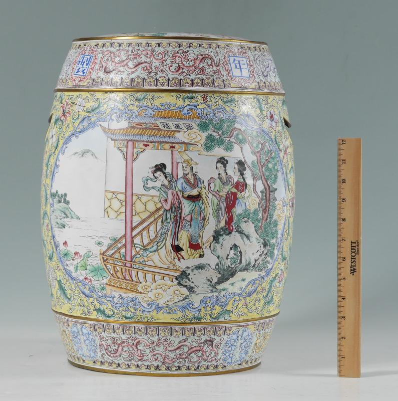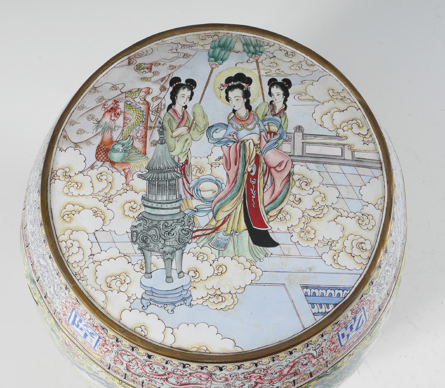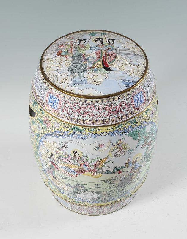 CHINESE FAMILLE JUANE ENAMELED GARDEN SEAT: Elaborate enamel on metal decoration, top with maidens, clouds and censer motif, sides with mythological gods and goddesses in one panel, outdoor genre scene with figures in the other, famille juane ground. 2 open handles, white enamel interior. Overall measures 17 1/2'' h. x 13 1/2'' dia.