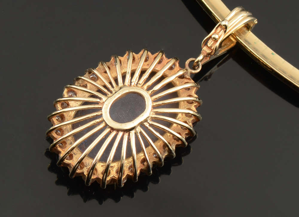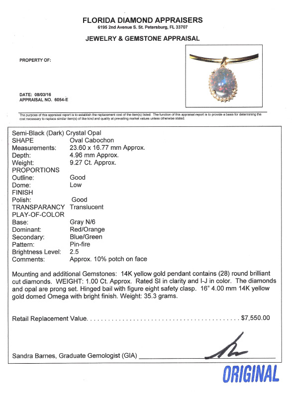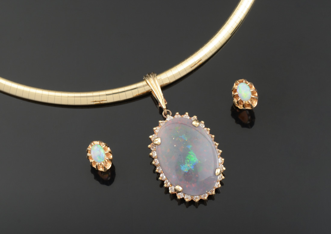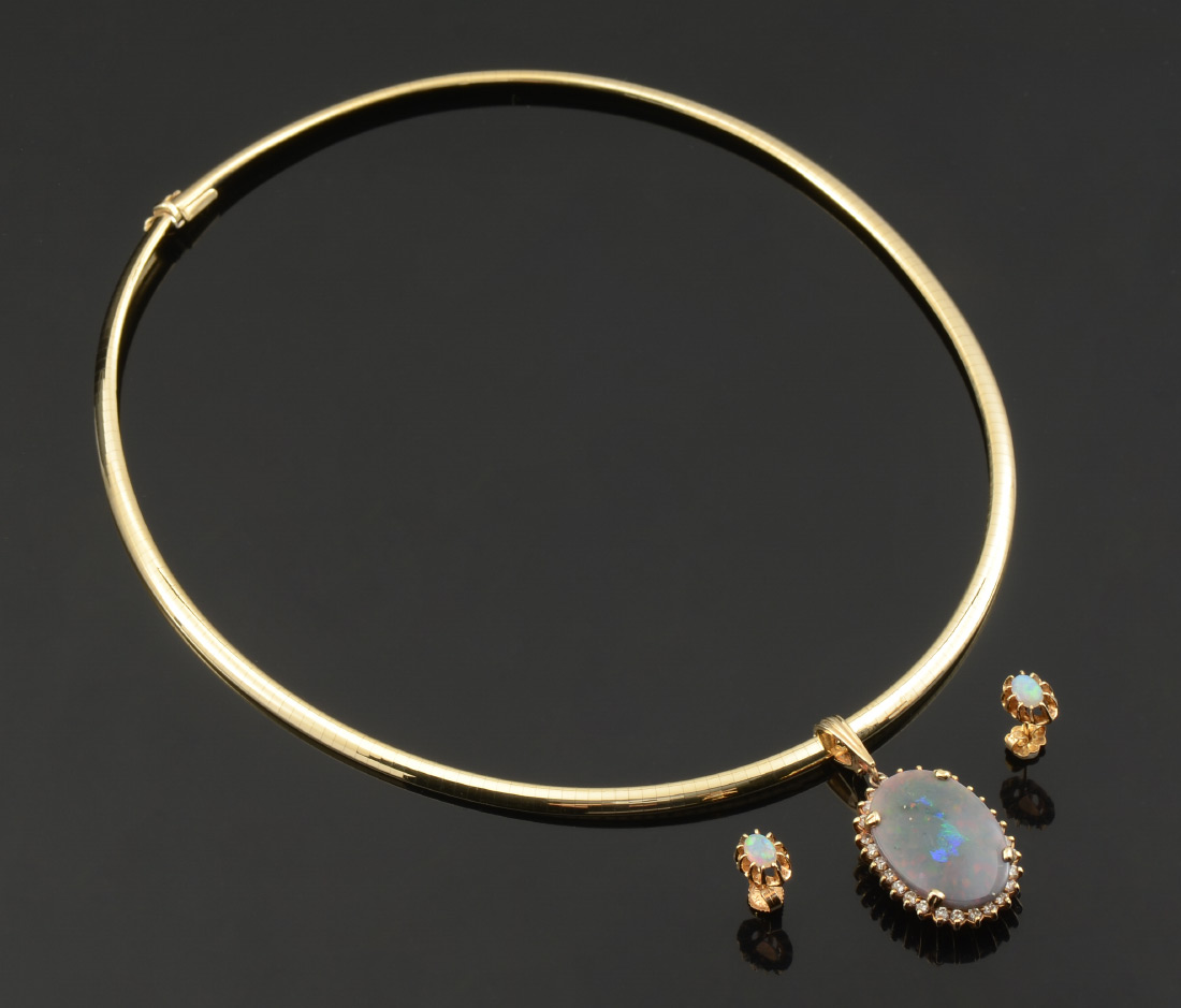 14K BLACK OPAL NECKLACE AND EARRINGS: 9.27 Ct. oval cabochon Opal is set into a 14K pendant with a hinged bail and figure eight safety clasp. 28 brilliant cut diamonds surround the opal, Weight 1.00 Ct. approx., rated SI in clarity and I-J in color. 16'' 4.00mm 14K yellow gold domed Omega collar. Weight 35.3 grams. Sold with current Florida Diamond Appraisers GIA graduates appraisal for $7550. Sold with 14K yellow gold earrings containing oval cabochon cut crystal opals. Weight: 1.00 Ct. Approx. Post and nut closures. Weight: 1.7 grams.