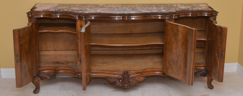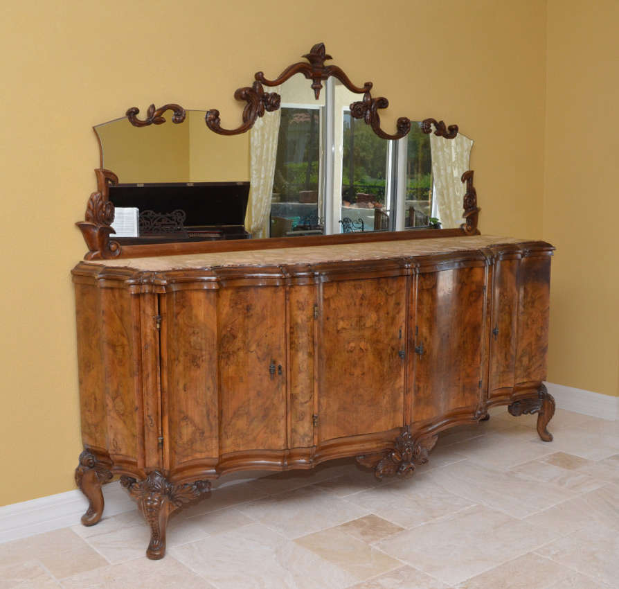 CONTINENTAL MARBLE TOP BURL SIDEBOARD WITH MIRROR: Shaped pink variegated inset marble top, serpentine scalloped top and front. 4 doors with fitted shelf interiors, carved skirt and feet, overall measures 40'' h. x 94'' x 24 1/2''. Sold with a carved wood frame wall mirror with foliate scroll motif, shaped mirror, overall approx. 34 1/2'' h. x 88'' x 2'' deep.