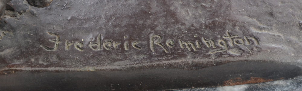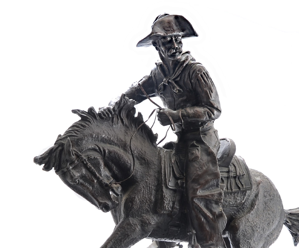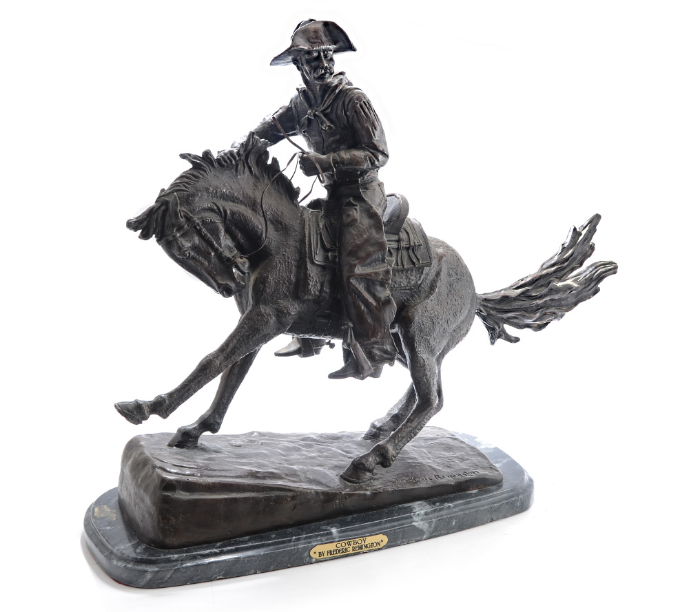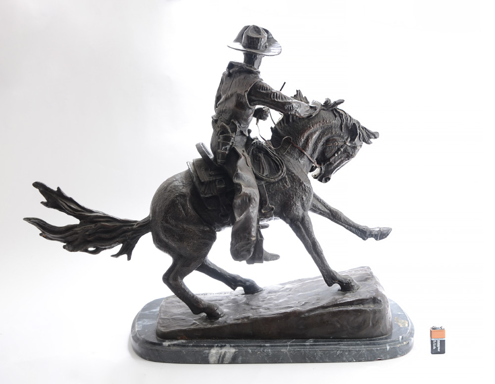 LARGE BRONZE AFTER REMINGTON TITLED COWBOY: 21'' h. x 25'' x 7'', affixed to beveled marble plinth, overall 22.25'' h.