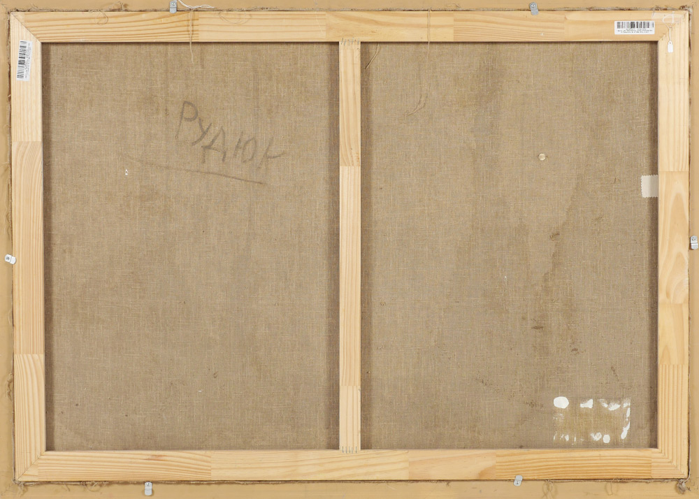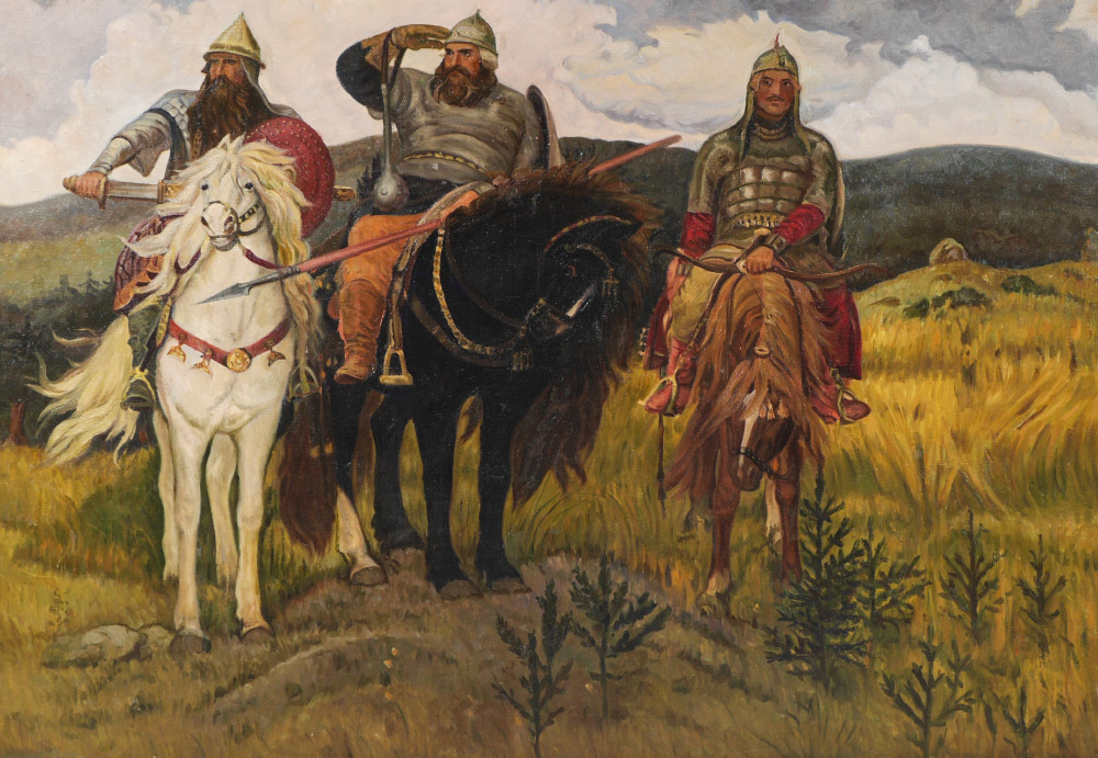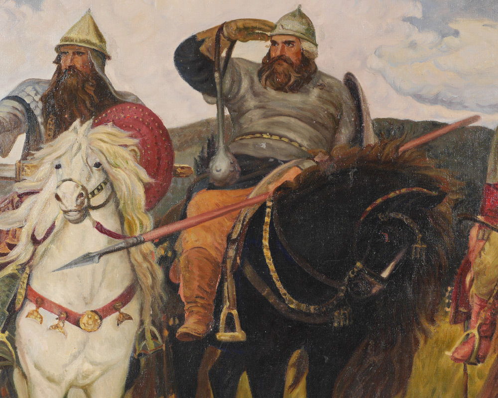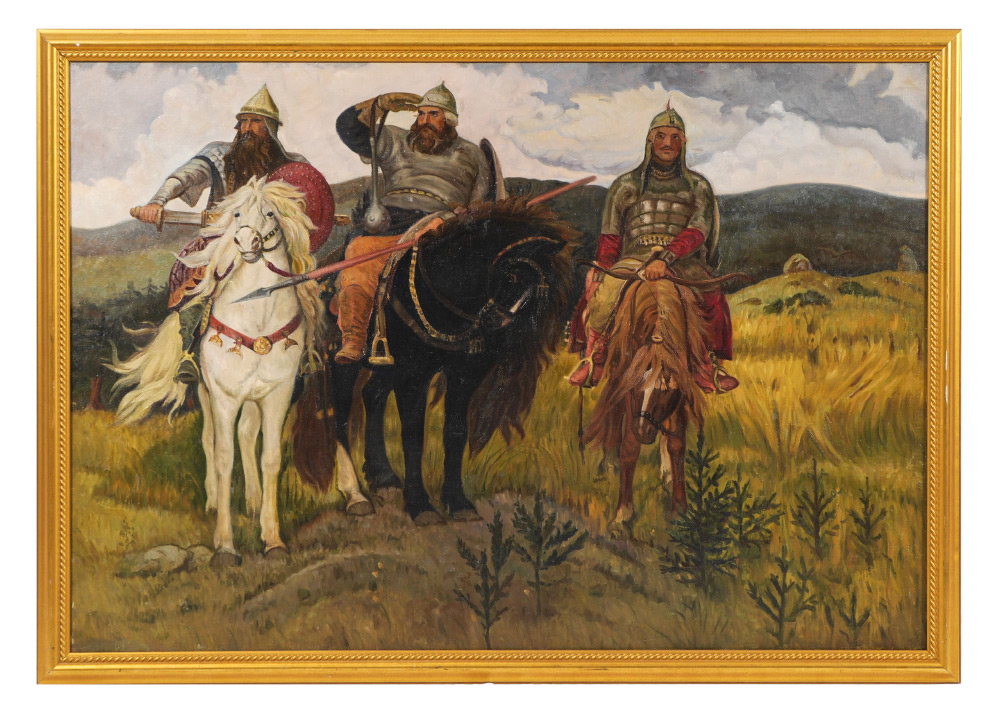 LARGE RUSSIAN PAINTING OF SOLDIERS ON HORSEBACK: Oil/Canvas, 35.5'' x 50.75'', signed verso, framed, 39'' x 54.5'', after Vasnetsov's ''Three Bogatyri''.