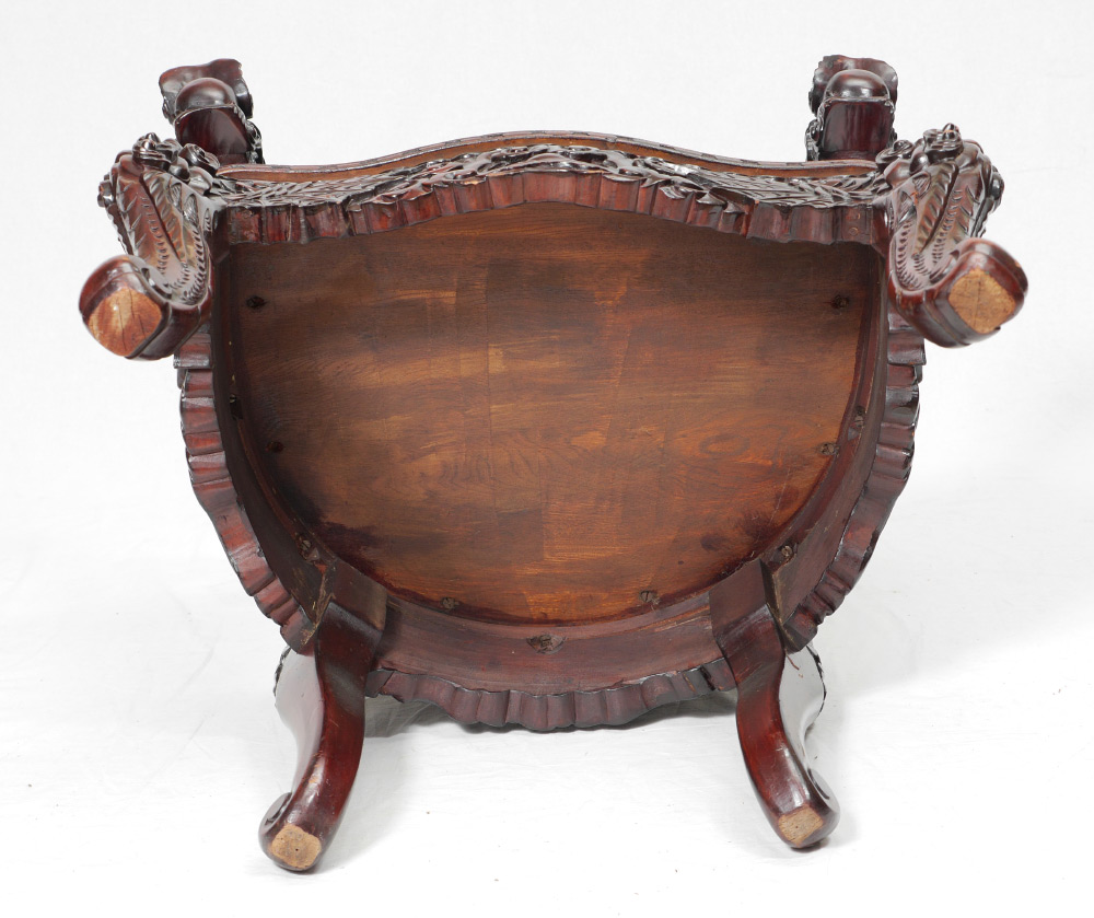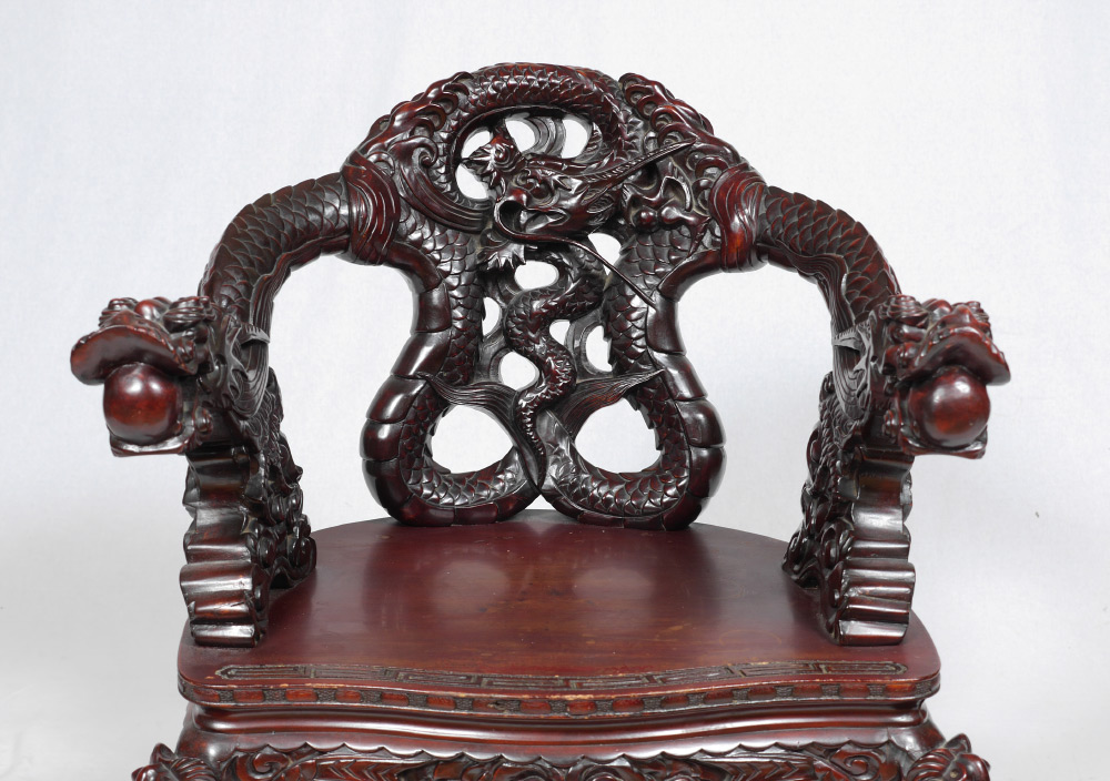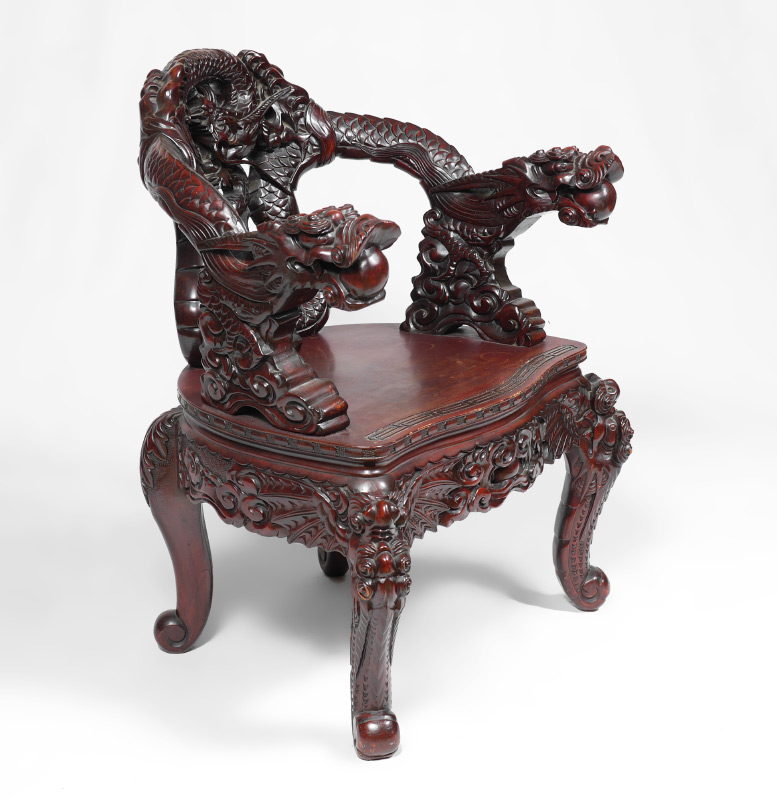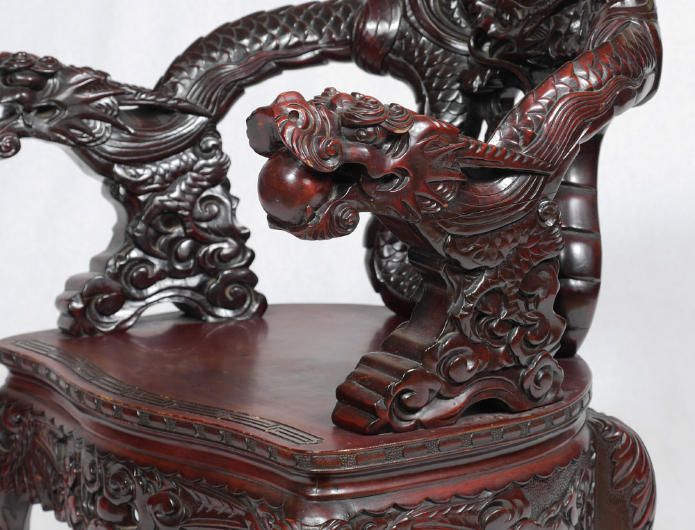 JAPANESE CARVED FIGURAL DRAGON CHAIR: Figural carved dragon back, arms and hand holds. Carved and shaped skirt with winged dragons at front knees, overall measures 32 1/4'' h. x 26 1/2'' x 22''.