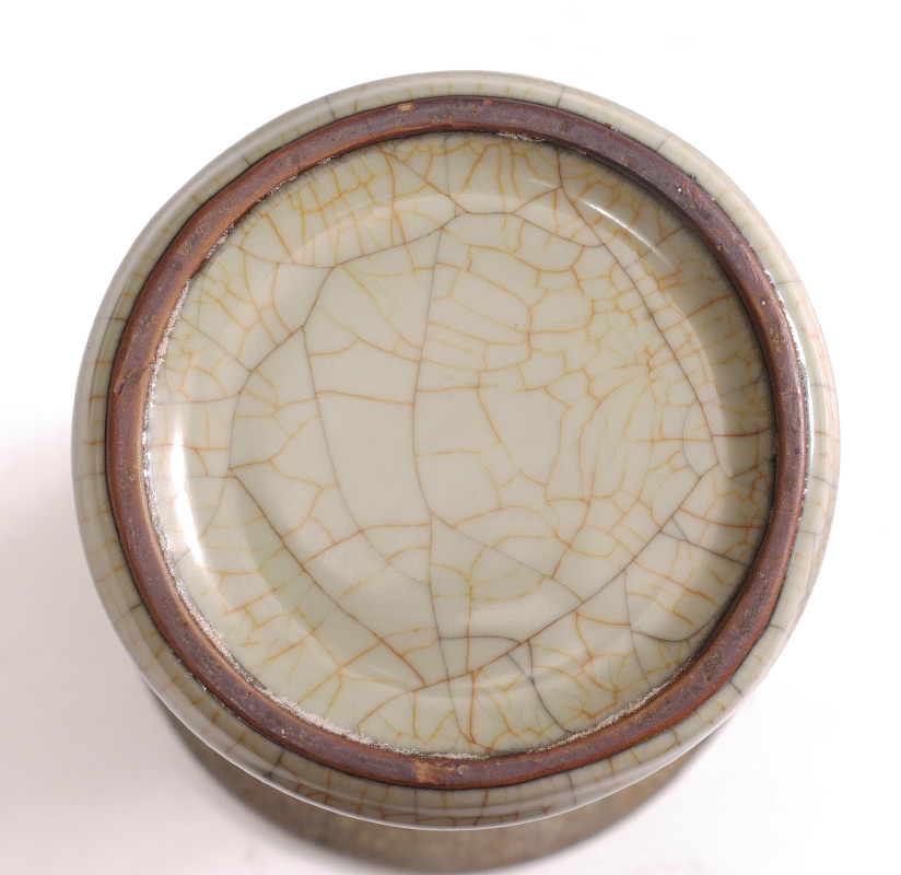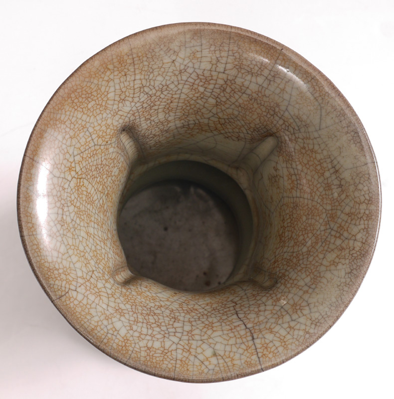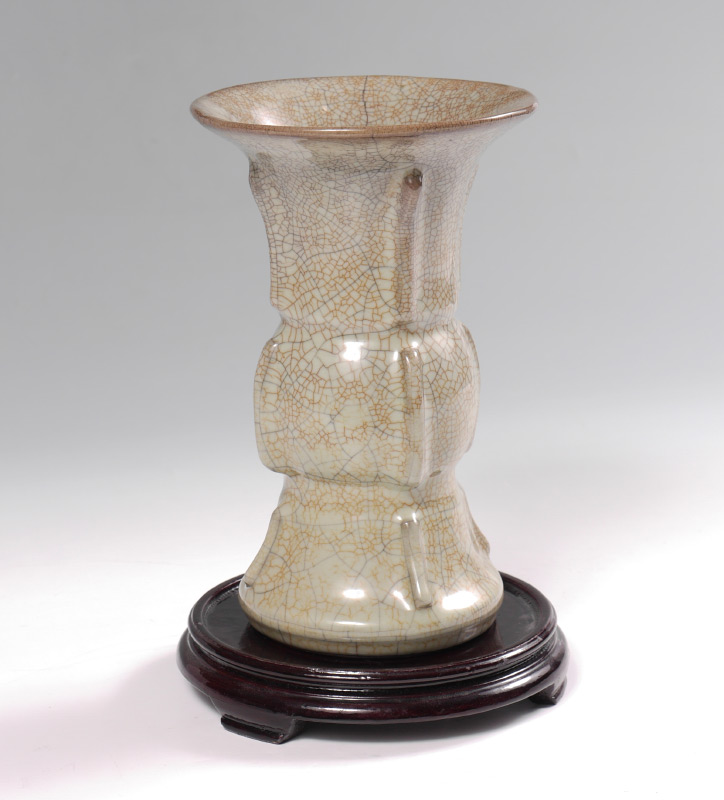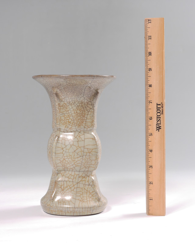 CHINESE CELADON CRACKLE GLAZE BEAKER VASE: Ge-type style celadon crackle glaze, beaker vase with flared rim, no visible markings, actual age unknown. Overall measures 6 1/8'' h. x 5 1/2''.
