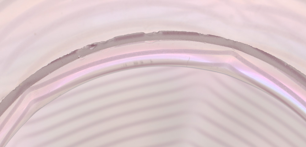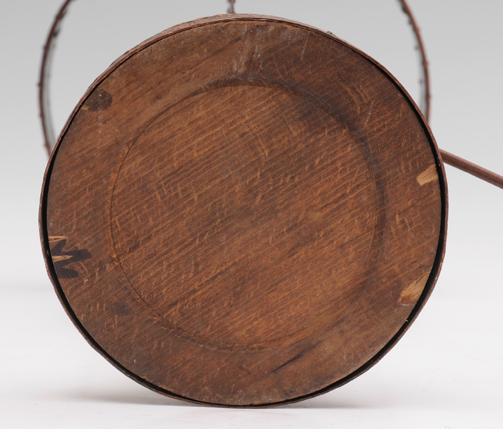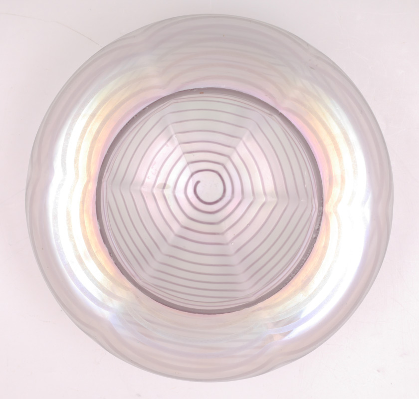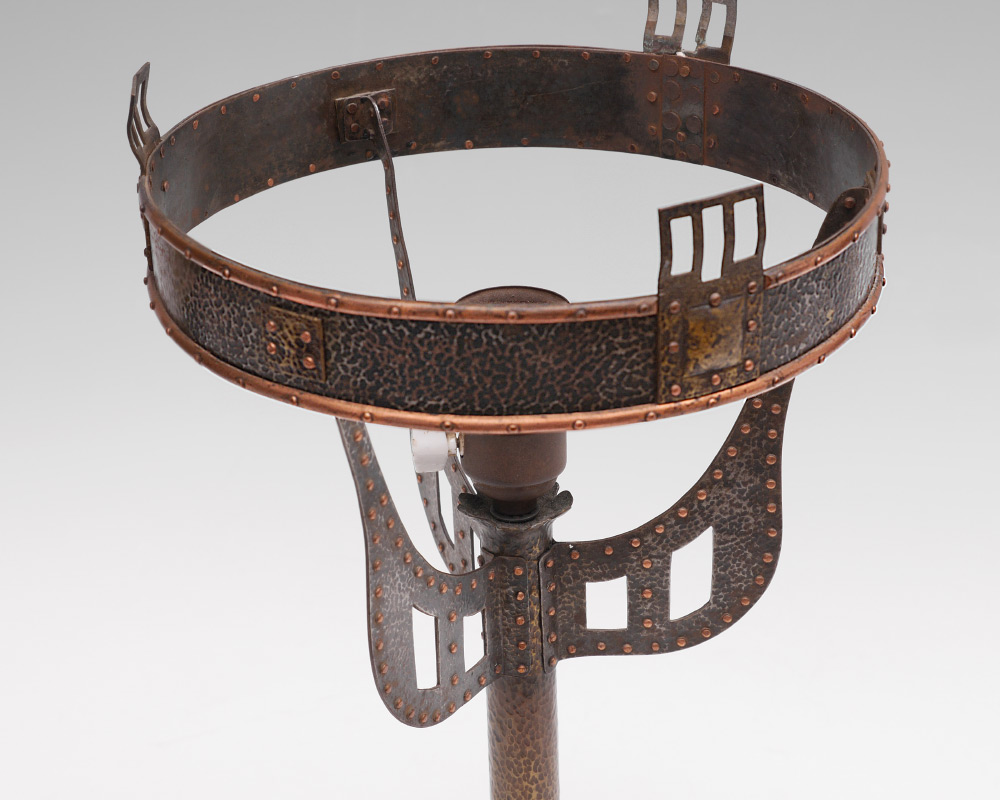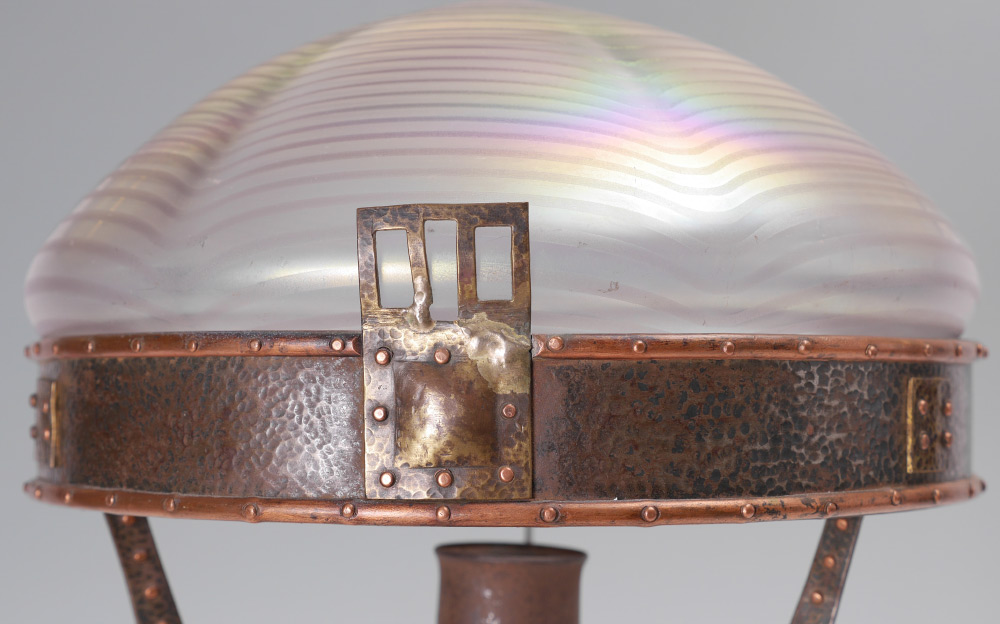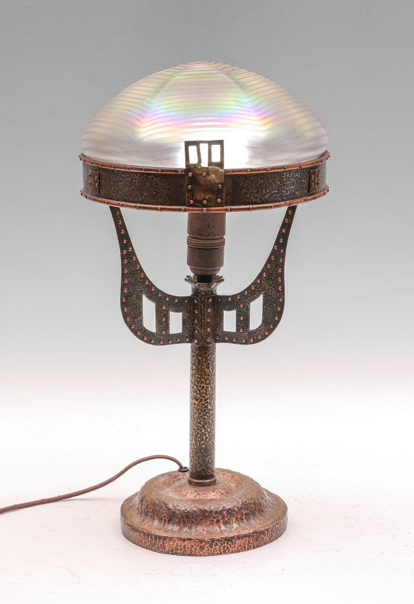GOTHIC REVIVAL COPPER LAMP WITH AUSTRIAN GLASS SHADE: Hammered copper lamp base with a distinctive gothic revival appearance, single socket, 16 1/2'' h. x 10'' dia. Sold with a married Austrian iridescent glass shade with purple swirl lines. Shade measures 4 1/4'' h. x 10'', fitter rim 5 5/8''.