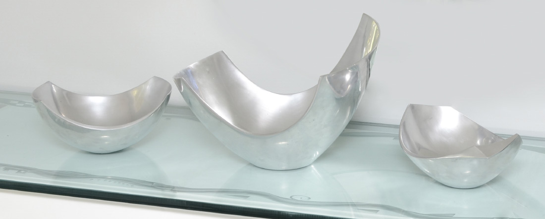 SET OF MICHAEL LAX ALUMINUM ''METAAL'' BOWLS: Set of 3 moderne design display or center bowls, all marked to bottom with model #'s - 6013, 6210 and the largest #6115 which measures 10 1/4'' x 13 1/2'' x 16''.