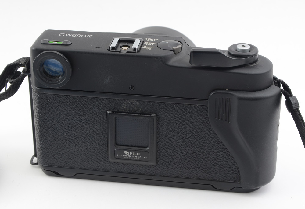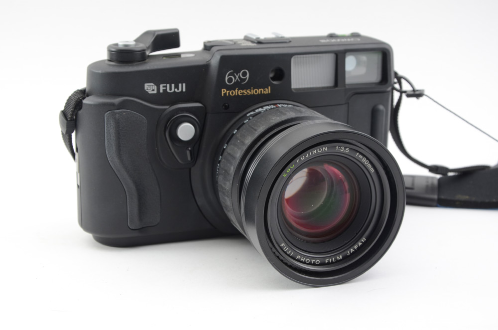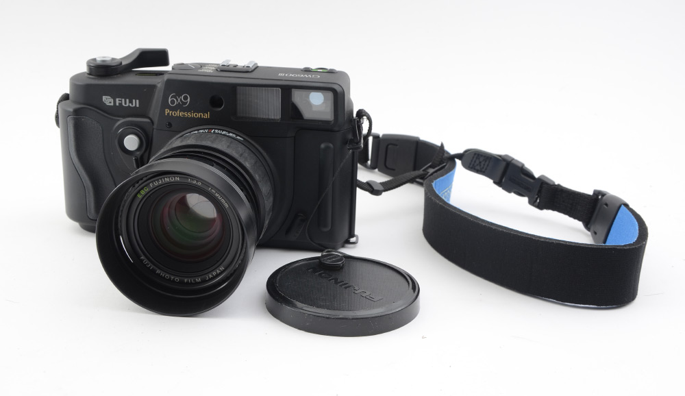 FUJI GW690III 6x9 CAMERA W/90MM F3.5: Fuji compact 6x9 format film camera equipped with a Fujinon SW 90mm f/3.5 lens. This camera belonged to Jack Yarian, professional photographer for the Tallahassee Democrat.