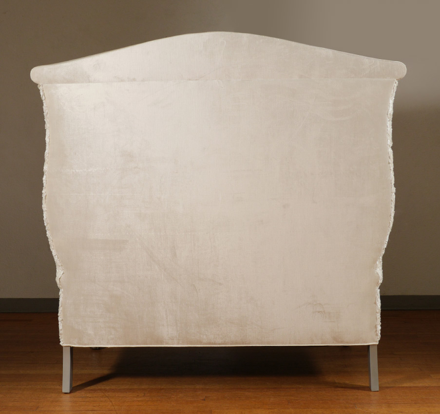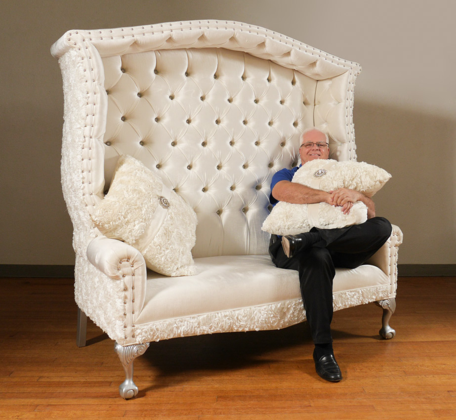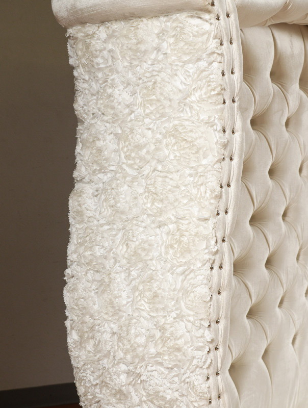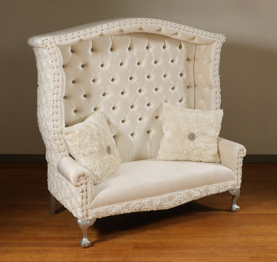 FABULOUS CANOPIED HOLLYWOOD REGENCY SOFA: High shaped canopy back tufted with rhinestone encrusted buttons. Sides with applied cloth chrysanthemum flowers, tacked front borders. Silver painted front ball and claw feet, no visible tags, possibly custom made. Sold with matching chrysanthemum bloom throw pillows with rhinestone accent. Overall measures 67 3/4'' h. x 69'' x 32''.