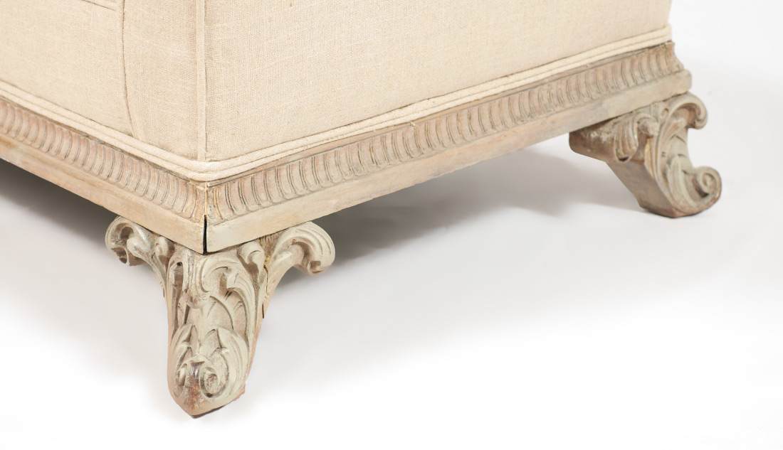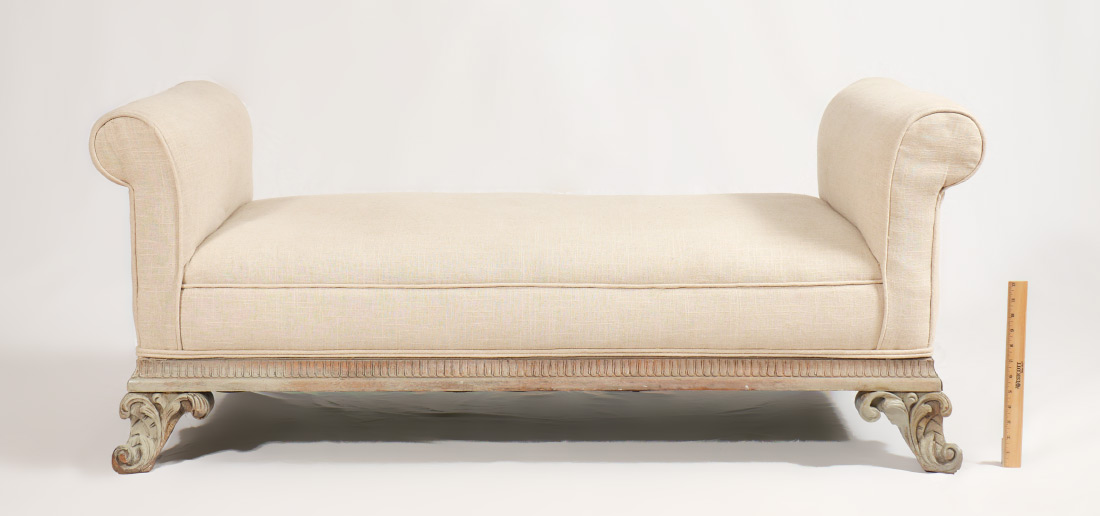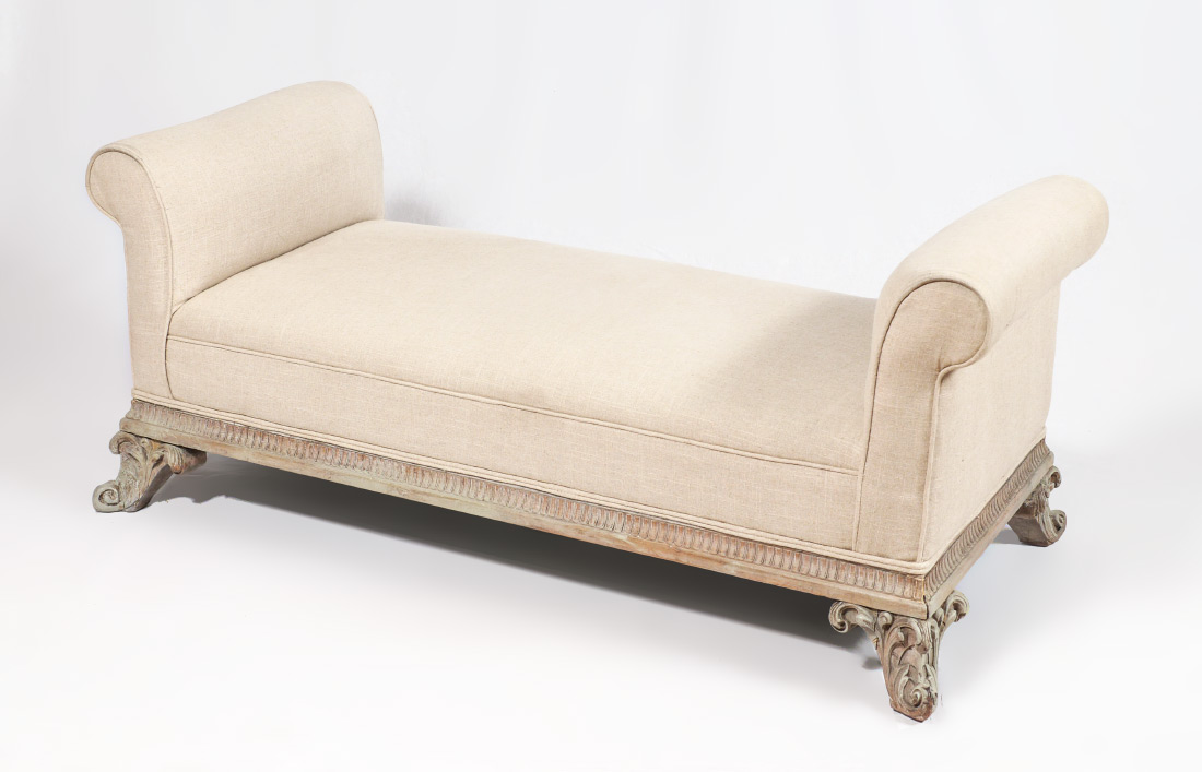 FRENCH EMPIRE STYLE CARVED BENCH: Arms with slight scroll, carved skirt and feet with antiqued grey paint. Taupe linen like upholstery, overall measures 23 1/2'' h. x 56'' x 23 1/4''.