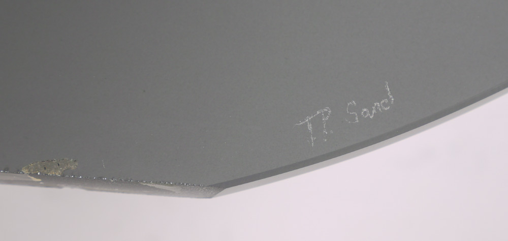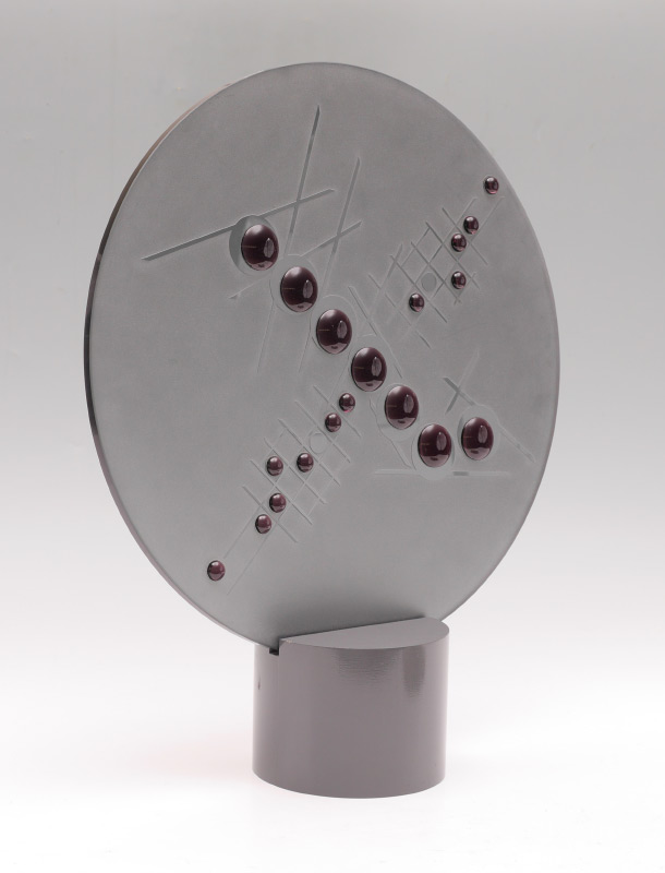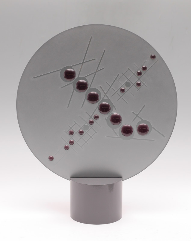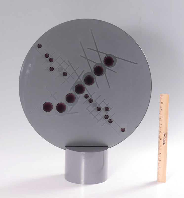 SAND, Towland Peter, (American, 1949-): Contemporary art glass sculpture, frosted amethyst glass medallion with etched geometric patterns and applied buttons. Signed T. P. Sand, 18'' dia. Sold with a grey painted plinth, 4 1/2'' h. x 6'' dia.