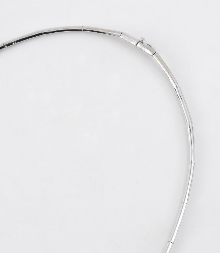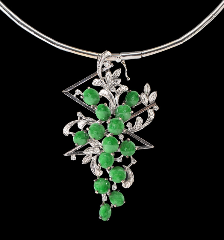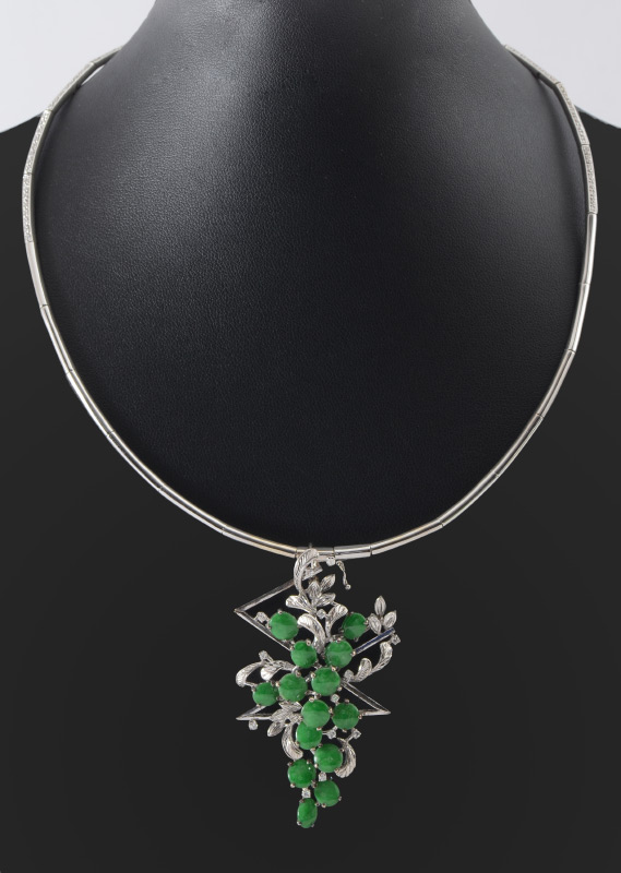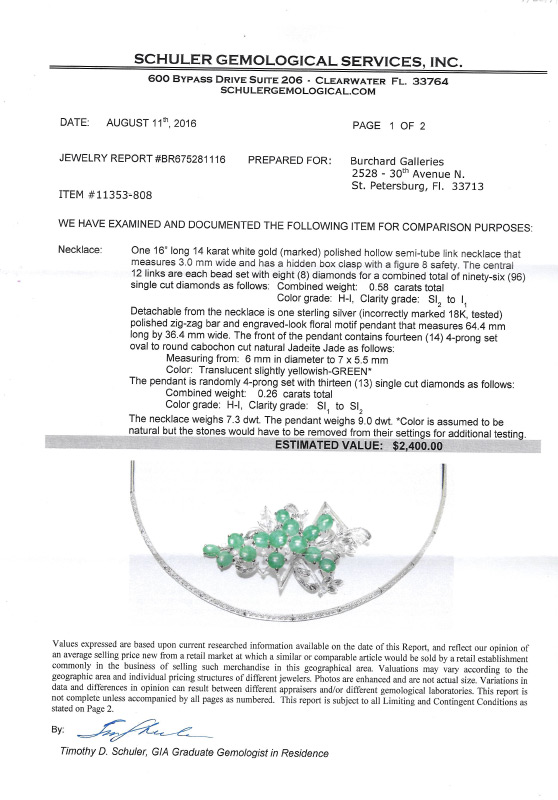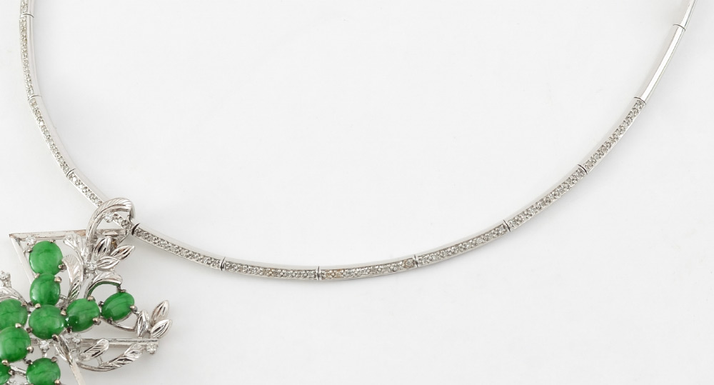 14K GOLD COLLAR NECKLACE WITH JADE & DIAMOND 925 PENDANT: 16''l. 14K white gold hollow semi-tube link necklace is centered by 12 links bead set with 8 diamonds each. Currently swinging from the choker necklace is a sterling silver pendant in a polished zig zag bar and engraved-look floral motif that contains 14 oval to round cabochon natural Jade. The pendant is randomly set with 13 single cut diamonds. Sold with current Schuler Gemological Services, Inc. appraisal for $2400.