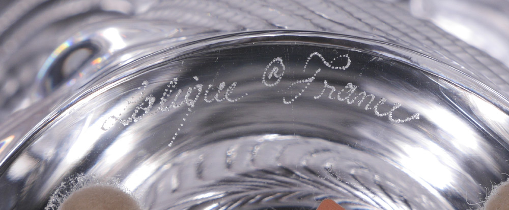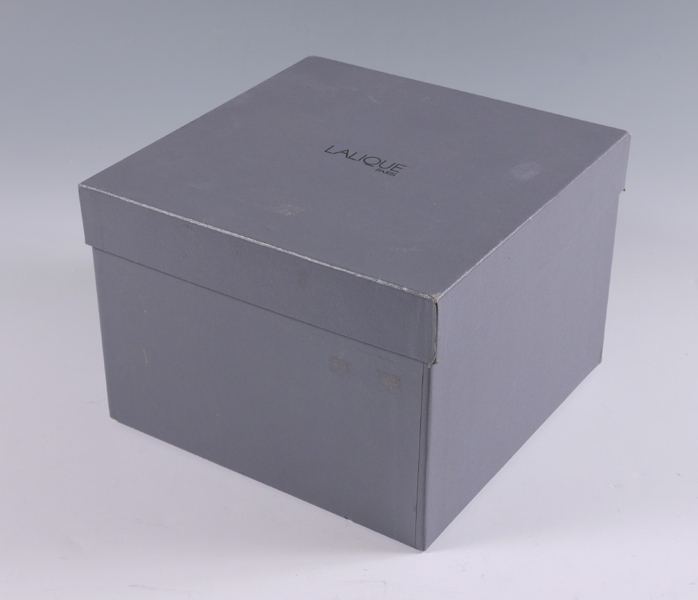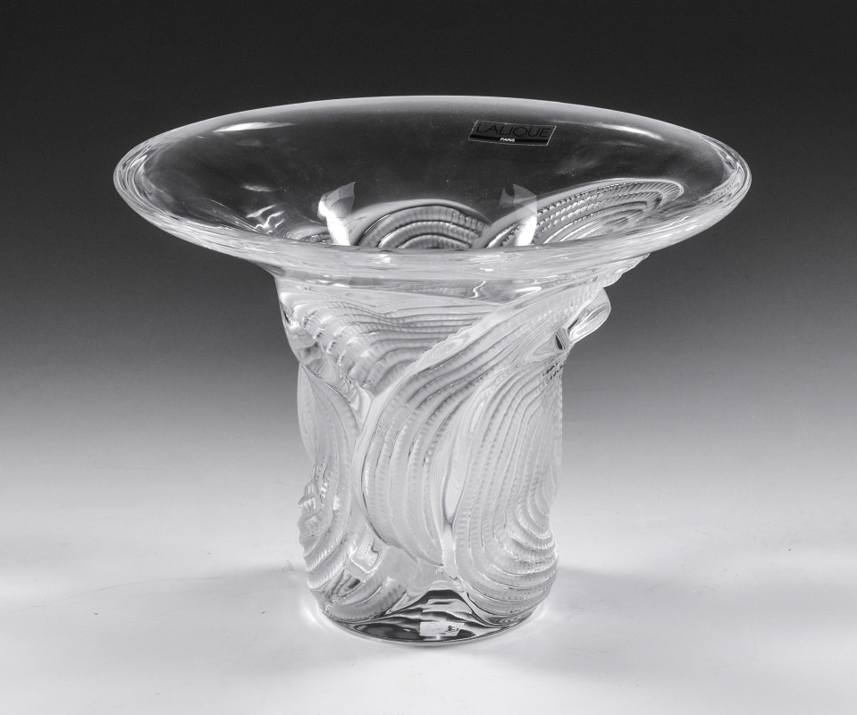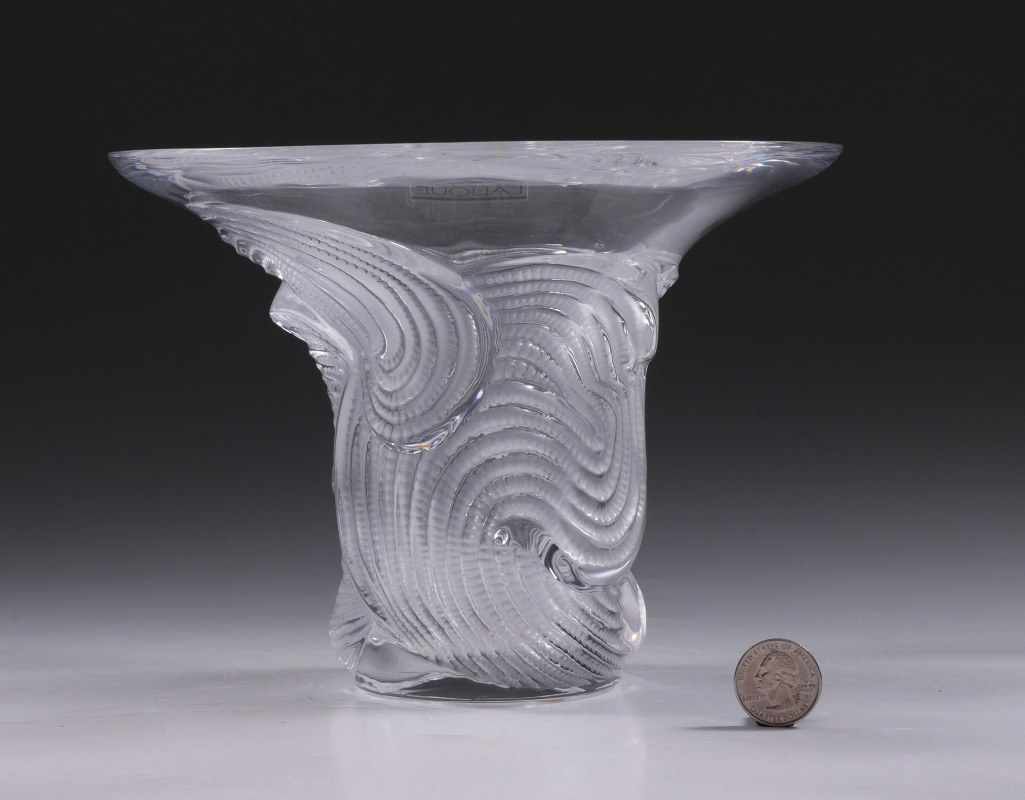LALIQUE CRYSTAL SERTELLA VASE: Clear crystal with flared rim and patterned body, 6 1/4'' h. x 8 1/2''. Sold with original Lalique box, 7'' h. x 10'' x 10''.