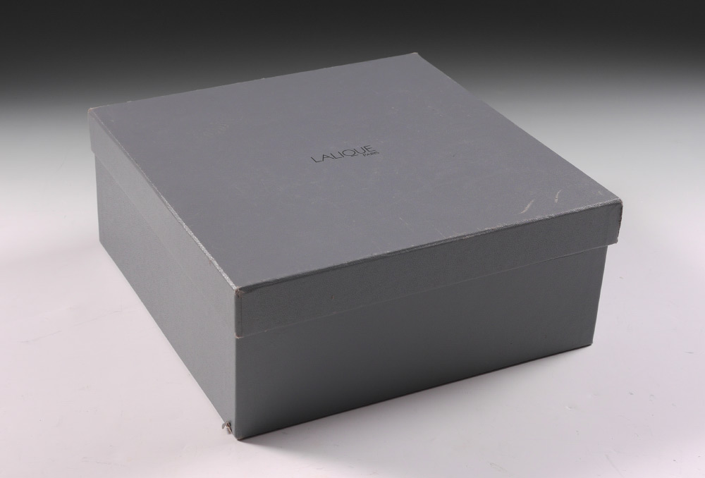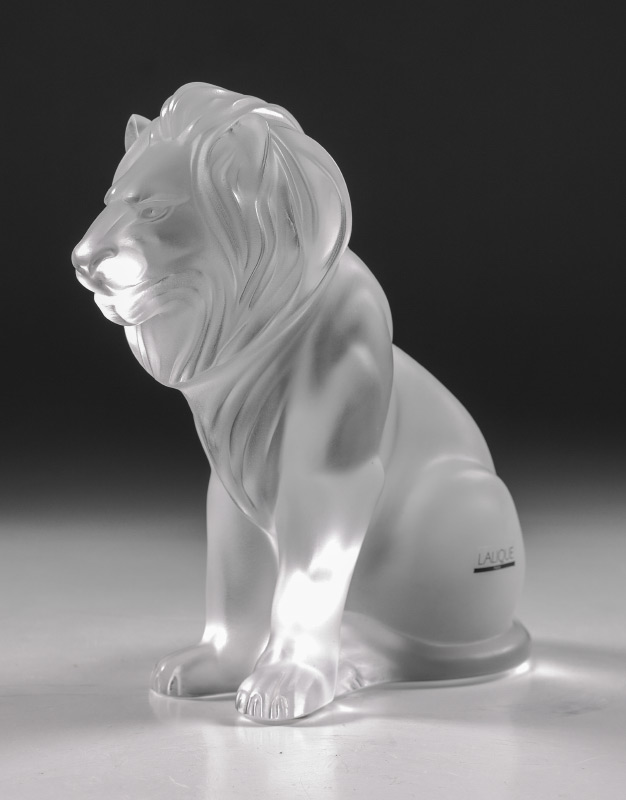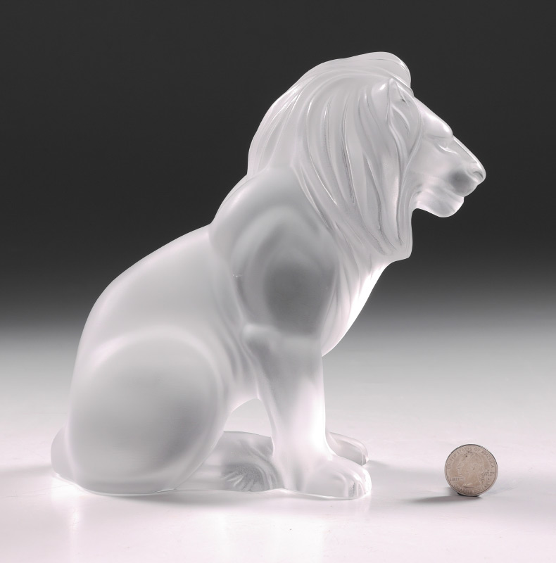 LALIQUE CRYSTAL BAMARA LION SEATED LION FIGURE: Designed by Marie-Claude Lalique, figure of a seated lion, 7 3/4'' h. x 3 1/4'' x 7 3/4''. Sold with the original box, 4 1/4'' x 10 1/2'' square.