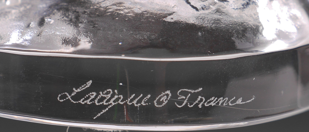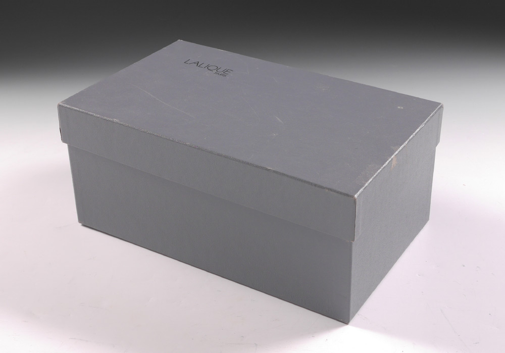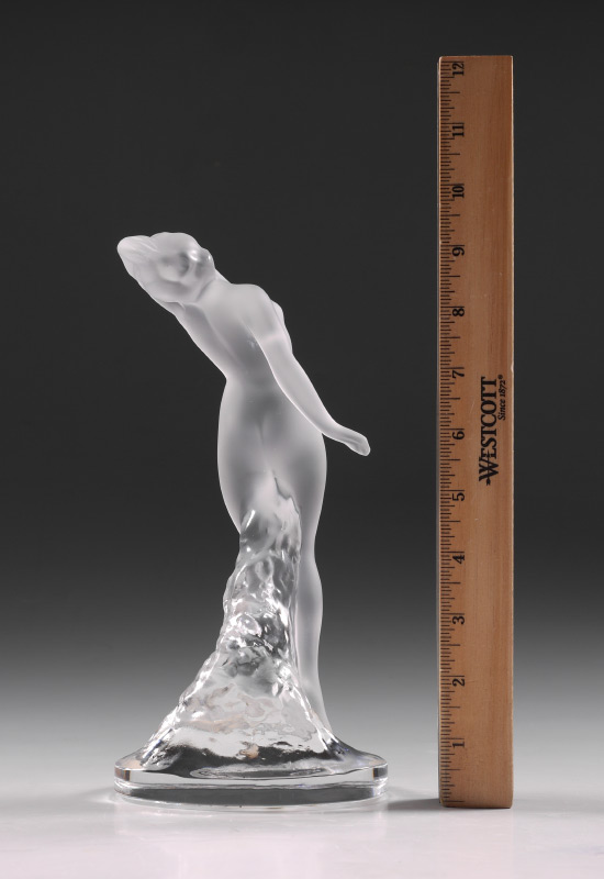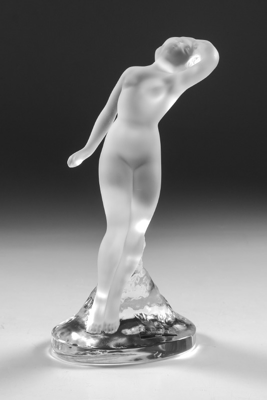LALIQUE CRYSTAL DANSEUSE BRAS BAISSE NUDE FIGURE: Frosted figure of a nude woman on clear base, 9 1/4'' h., sold with original box 5 1/4'' h. x 12'' x 7 1/2''.