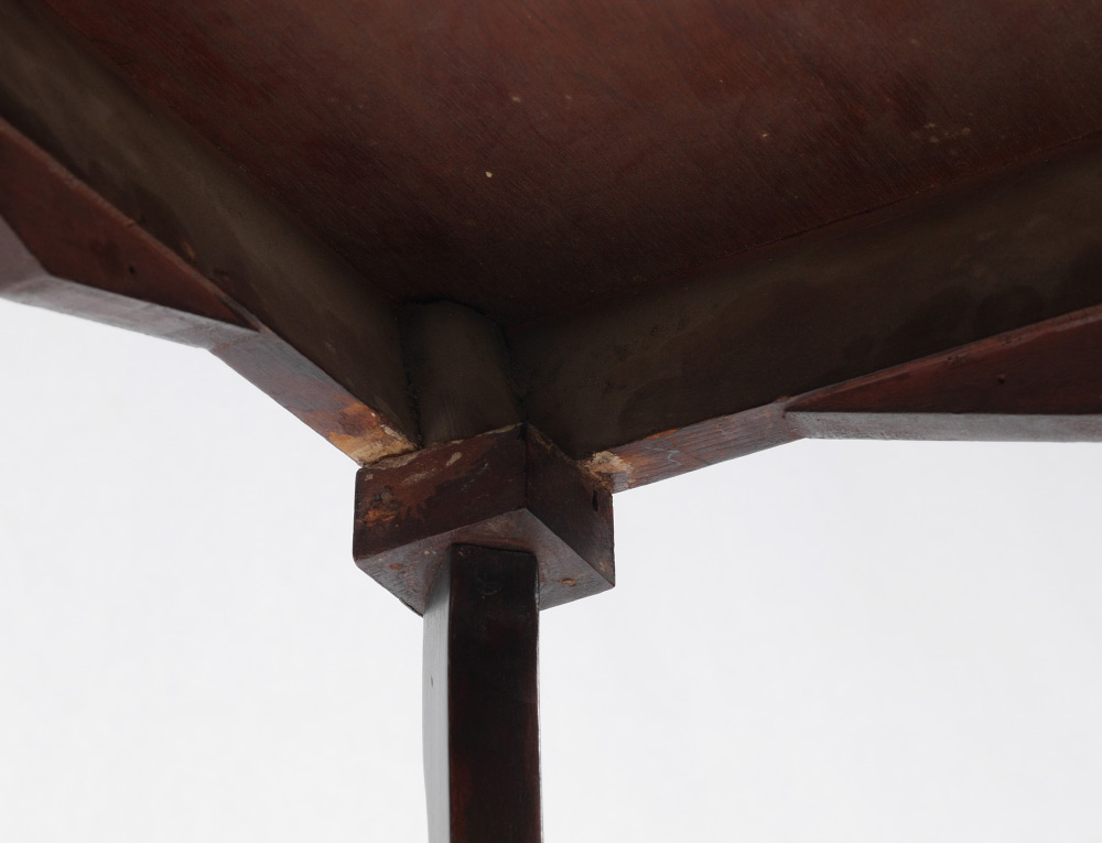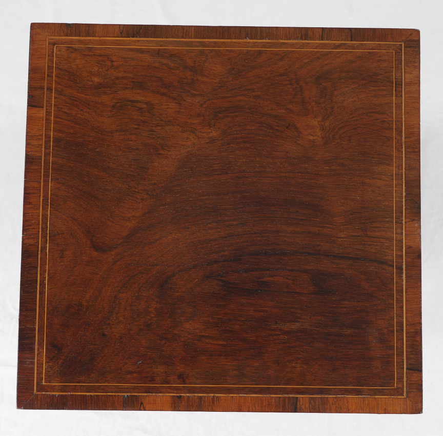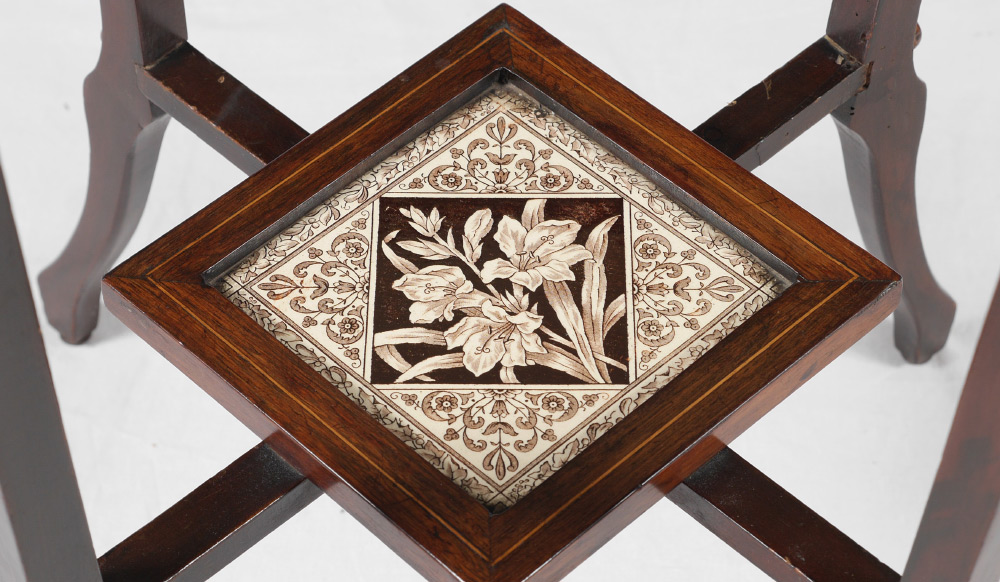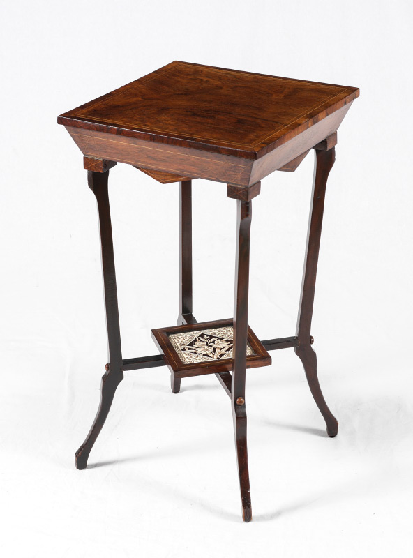 BANDED MAHOGANY DUTCH SIDE TABLE: Square banded mahogany top, string inlay on top and shaped skirt. Shaped legs, lower stretchers with inset floral motif tile shelf, overall measures 29'' h. x 16'' square. CONDITION: Wear consistent with age and use.