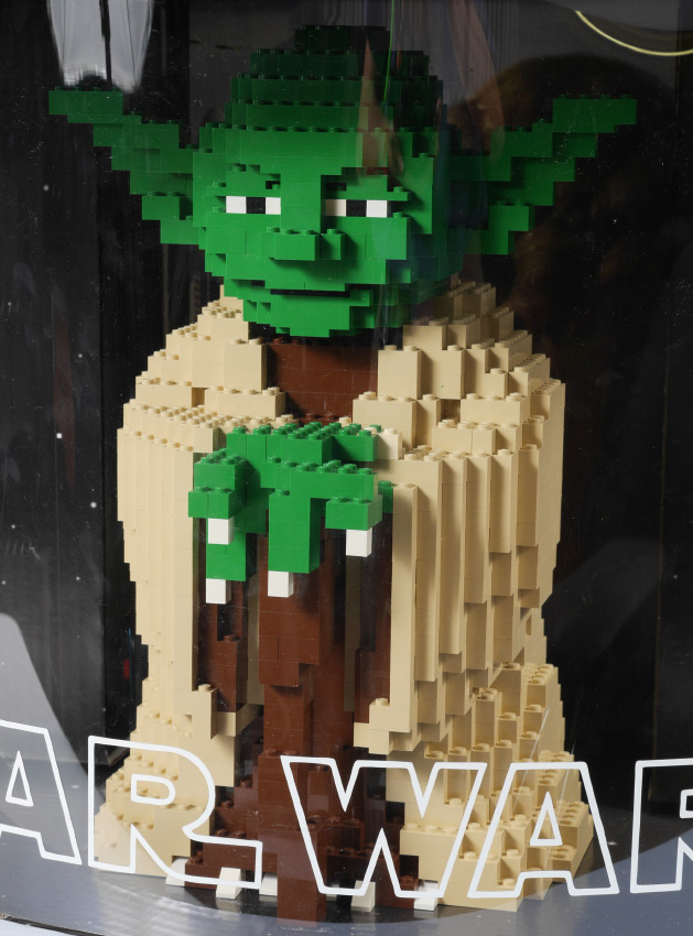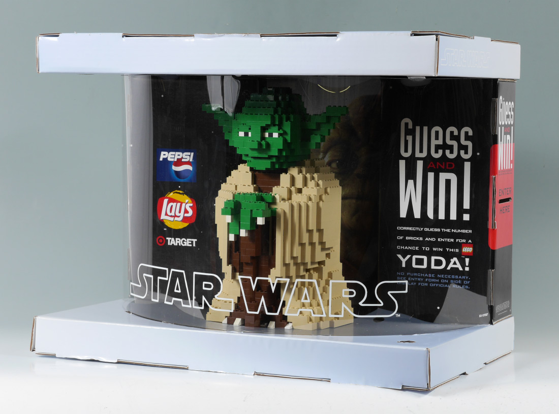 TARGET LEGO YODA FIGURE PRIZE PACKAGE: Figure of the Star Wars Jedi Knight Yoda made completely of Lego blocks. In the prize display box from Target, overall measures 18 1/2'' x 24'' x 14 1/2''.