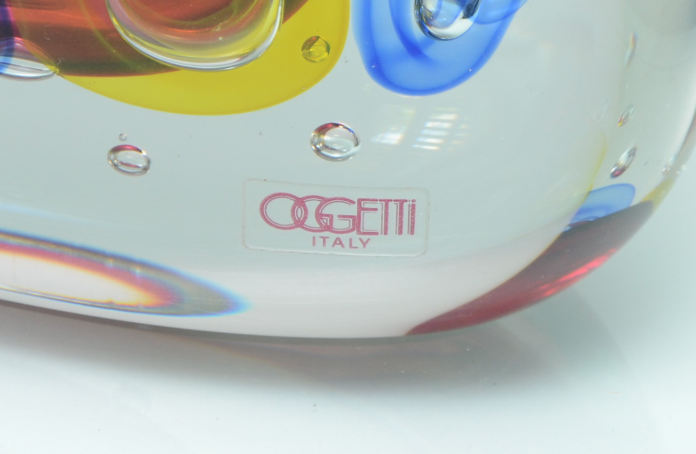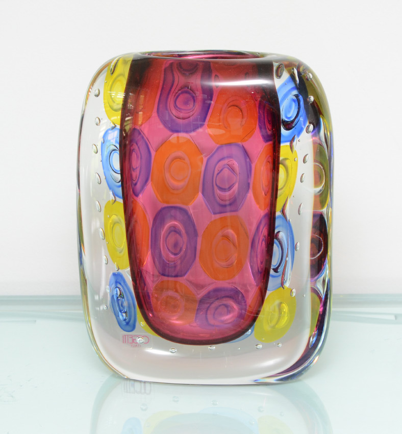 LUIGI ONESTO FOR OGGETTI MURANO GLASS VASE: Multi color design with control bubble, signed L. Onesto, Murano, Italy with original Oggetti clear label. Overall measures 10 3/4'' h. x 8 1/4'' x 4''.