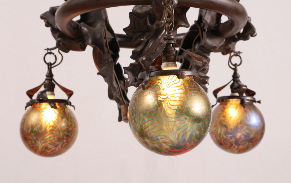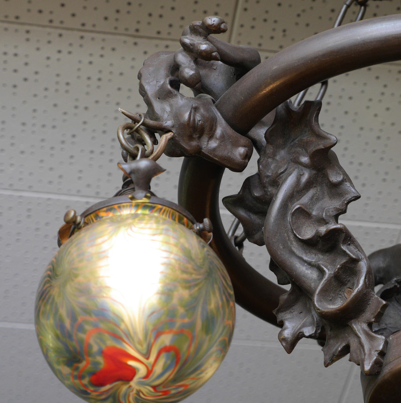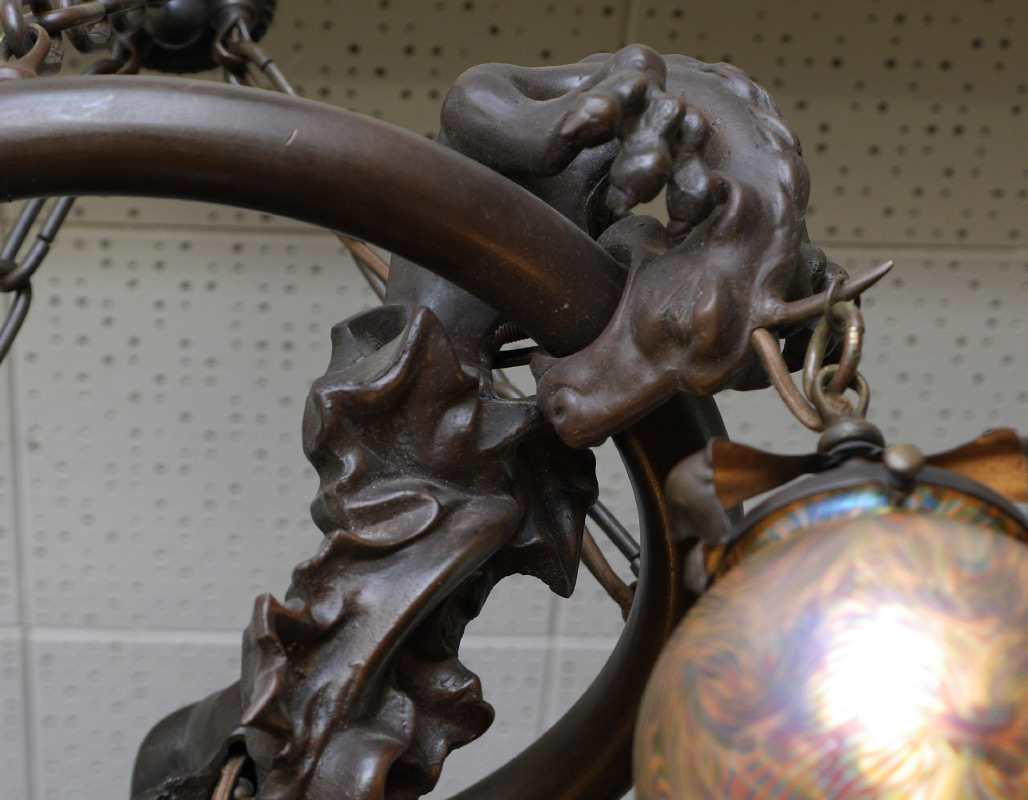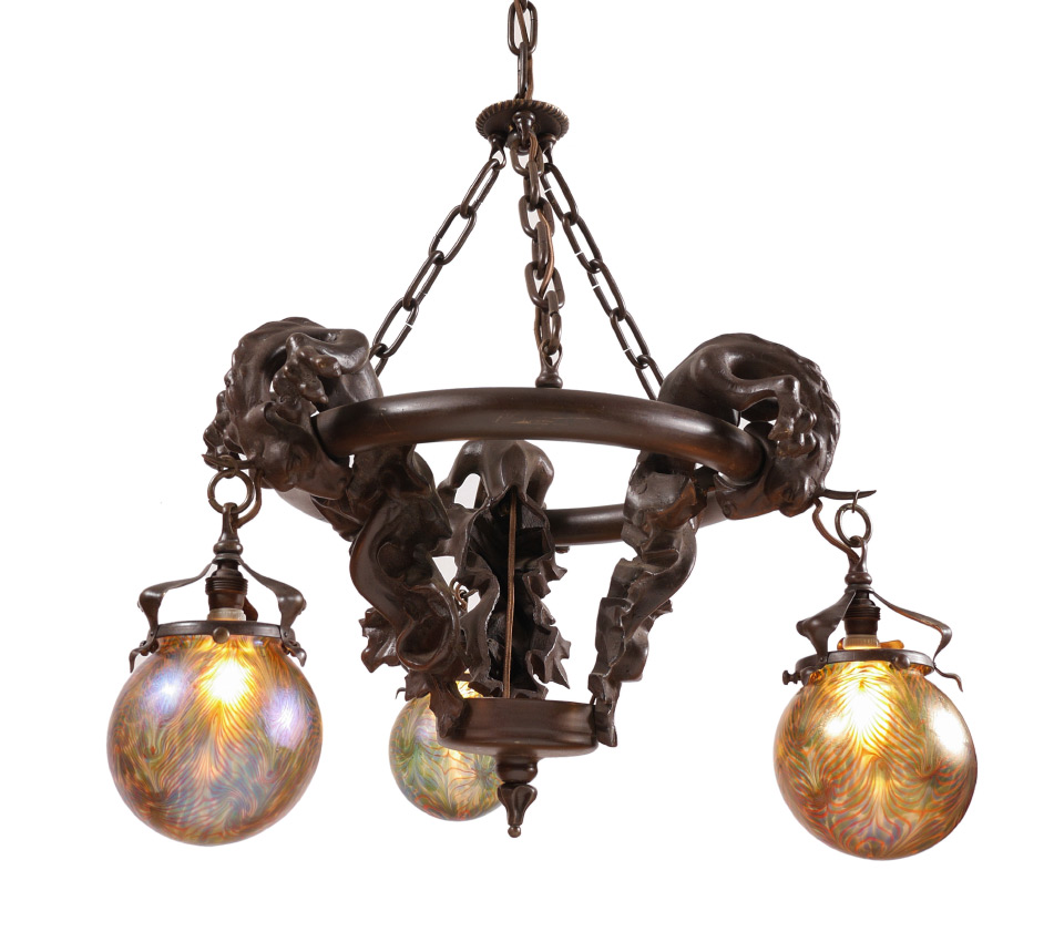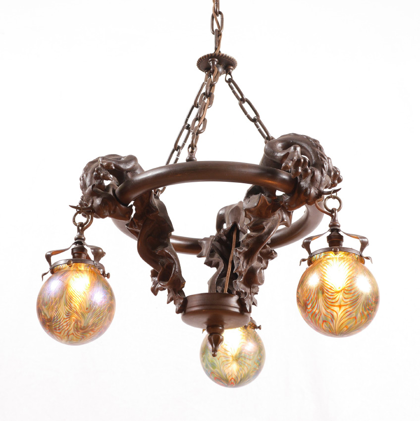 AUSTRIAN GOTHIC REVIVAL FIGURAL DRAGON HANGING LIGHT: Early 20th century Austrian patinated metal with 3 figural dragons over 3 lights with Austrian pulled feather art glass globe shades. Light measures 22 3/4'' h. x 21'', shades 4 3/4'' dia with a 3 1/4'' fitter rim.