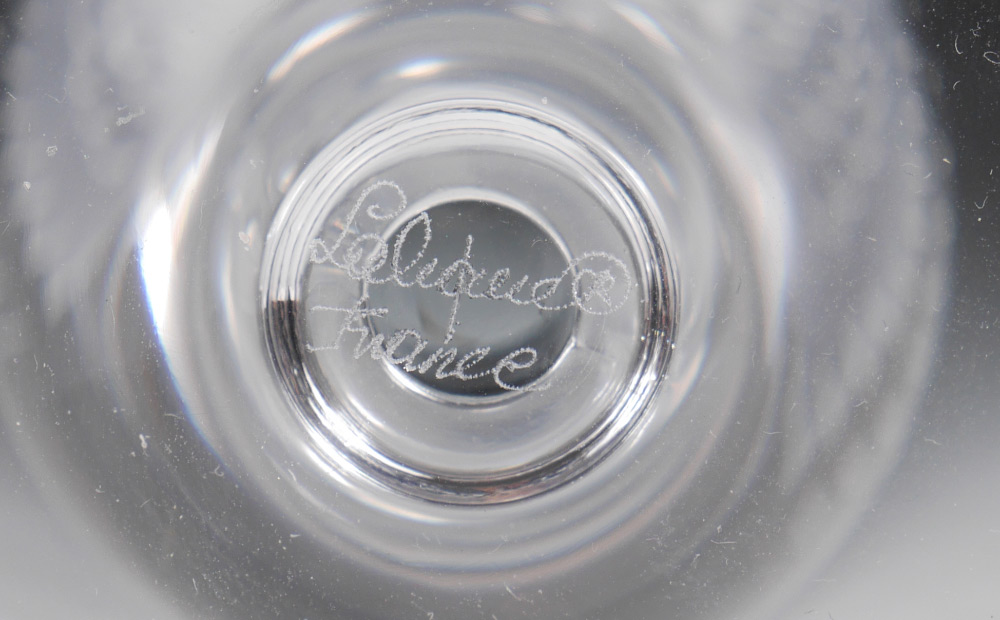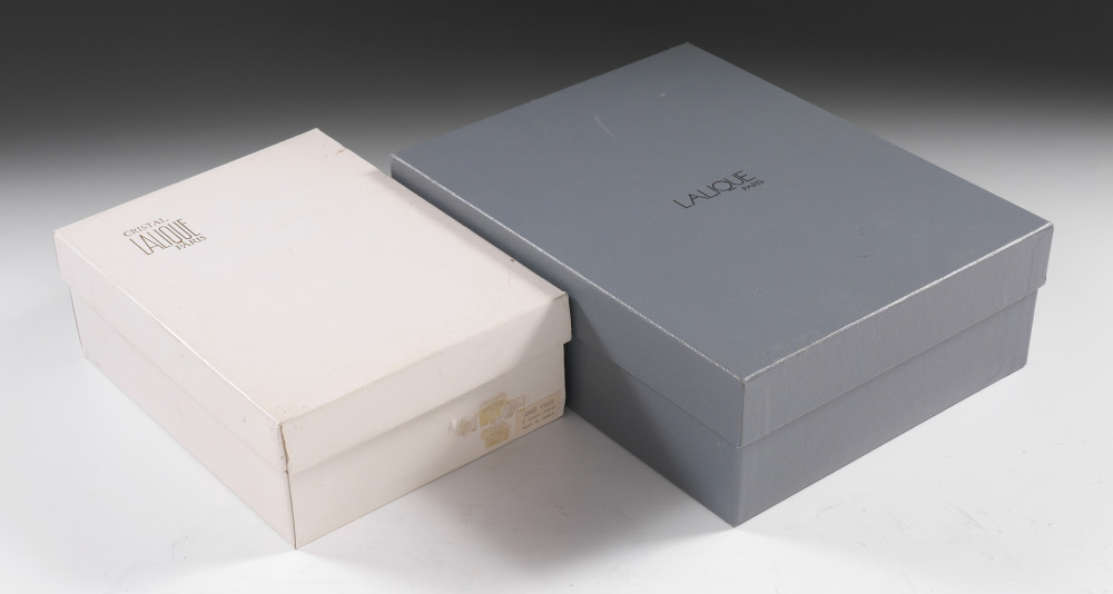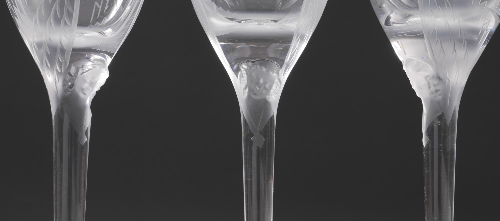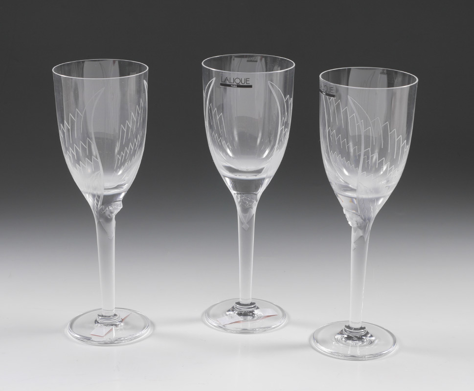 3 LALIQUE CRYSTAL ''ANGE'' ANGEL CHAMPAGNE FLUTES: 3 clear glass with frosted angel design, 8'' h. Sold with 2 different original boxes, larger 4'' h. x 9 1/2'' x 12''.