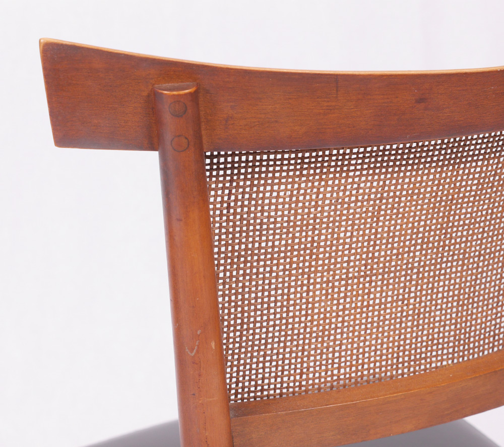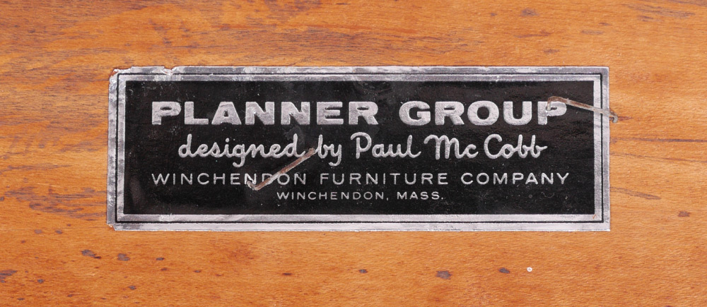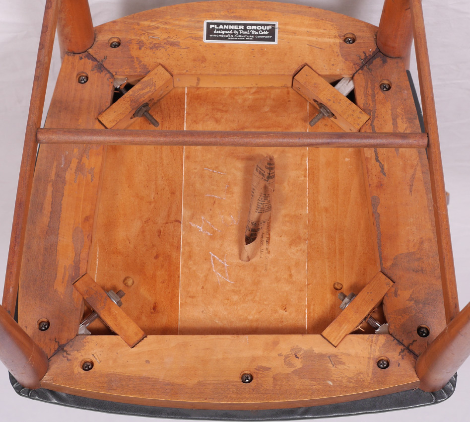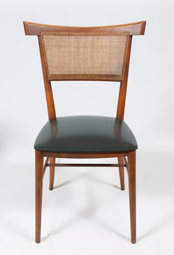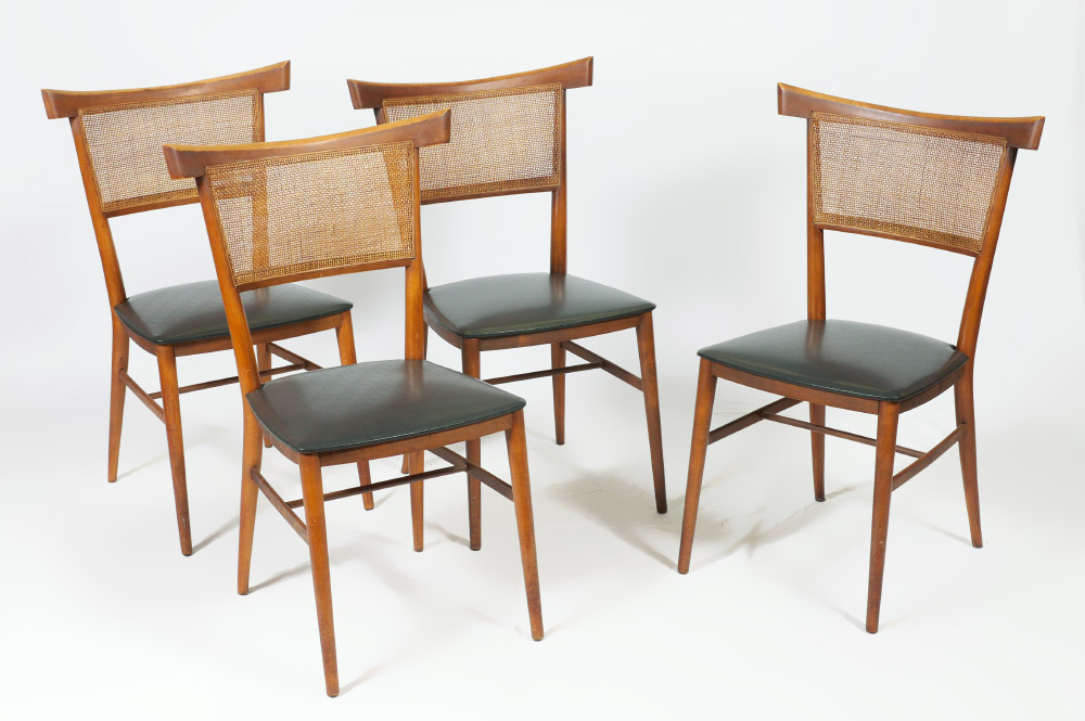 4 PAUL MCCOBB PLANNER GROUP CHAIRS: Shaped back with caned panels, tapered legs, black vinyl seats. One with original Planner Group / Paul McCobb / Winchendon Furniture label. 33 1/2'' h. x 22'' x 19''.