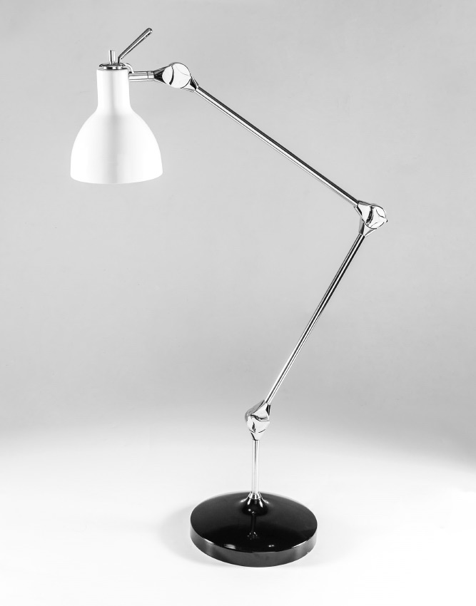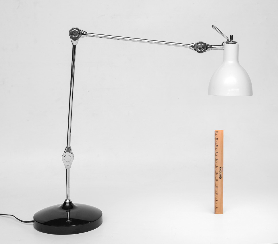 DAZOR WORLD-LITE TABLE LAMP: Mid-century design, white metal shade, chrome arm with 3 joints, weighted black metal base. Overall in standard position, 26 1/2'' h. x 30'' x 9 1/2''.
