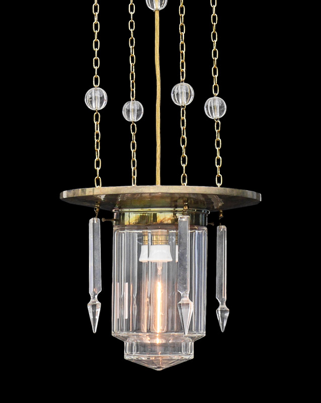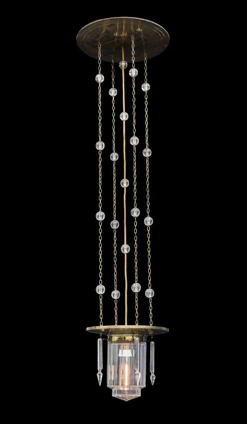 MODERNE BRASS & GLASS HANGING LIGHT: Single light in molded clear glass shade with crystal prisms, hangs from 4 chains and electric cord with glass spheres. Overall measures 48'' h. x 10 1/2'' dia when hung.