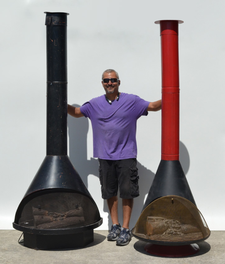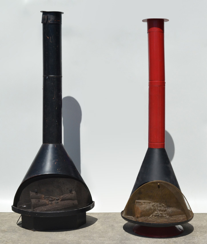 2 AFTER WENDELL LOVETT ELECTRIC FIREPLACES: Circa 1970's after the classic Wendell Lovett design, unmarked, 2 similar but not identical fireplaces with slightly different shapes and bases. Larger of the 2 fully assembled measures 93'' h. x 34'' x 26''.