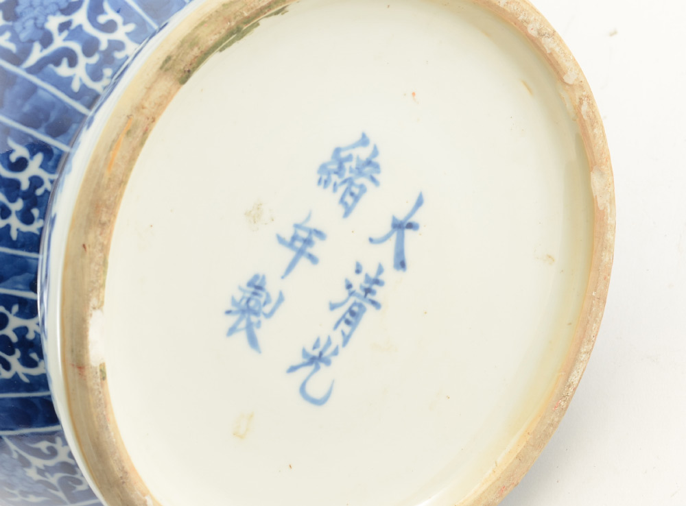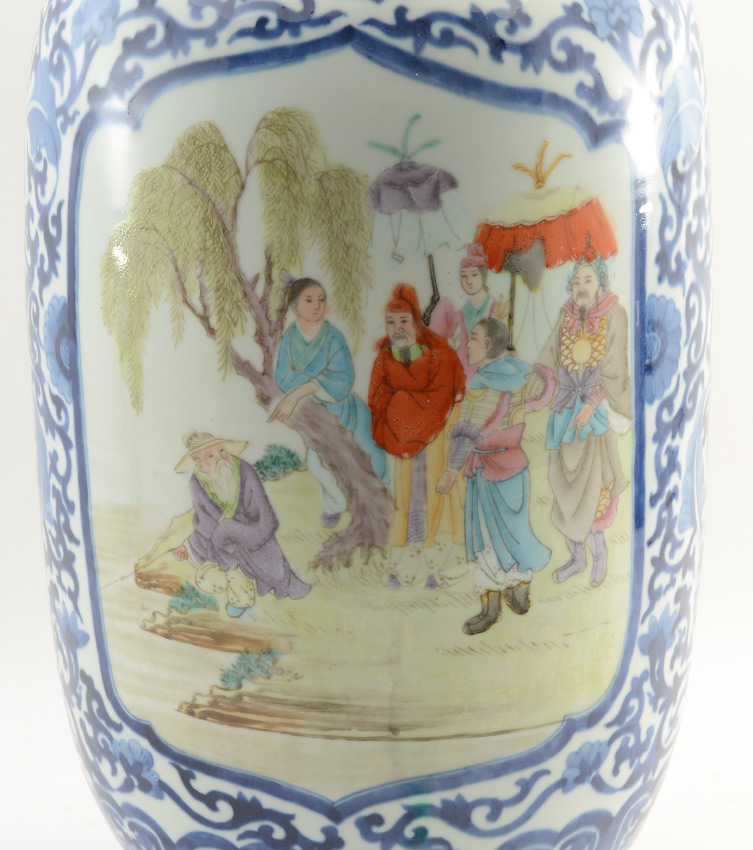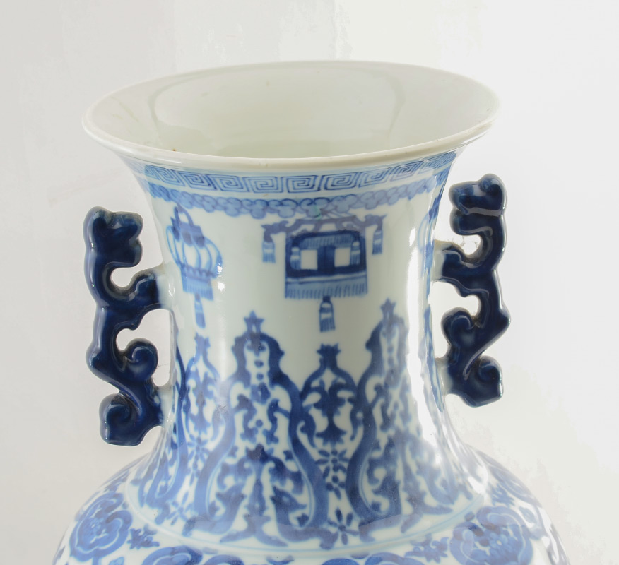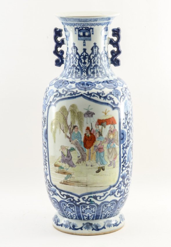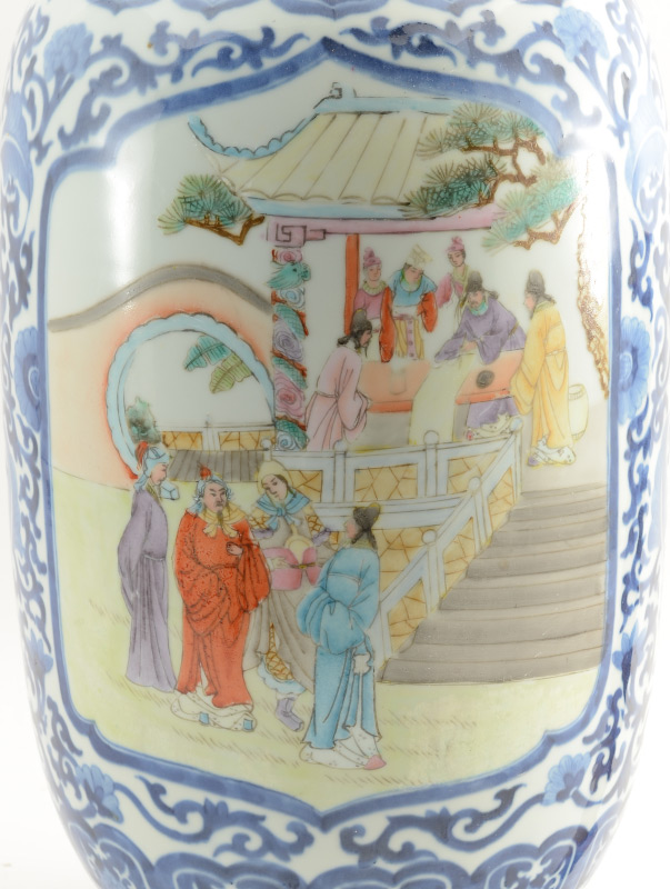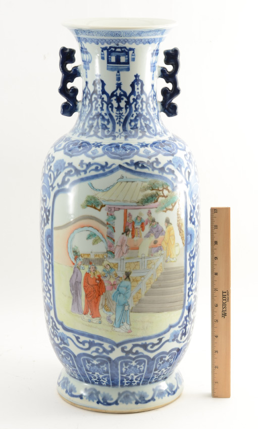 CHINESE BLUE, WHITE, AND POLYCHROME DECORATED VASE: Baluster form floor vase with applied handles, polychrome outdoor genre scenes either side, balance of body with blue and white decoration. Marked on base with blue Qianlong marks, actual age unknown, measures 23 1/4'' x 9'' dia.