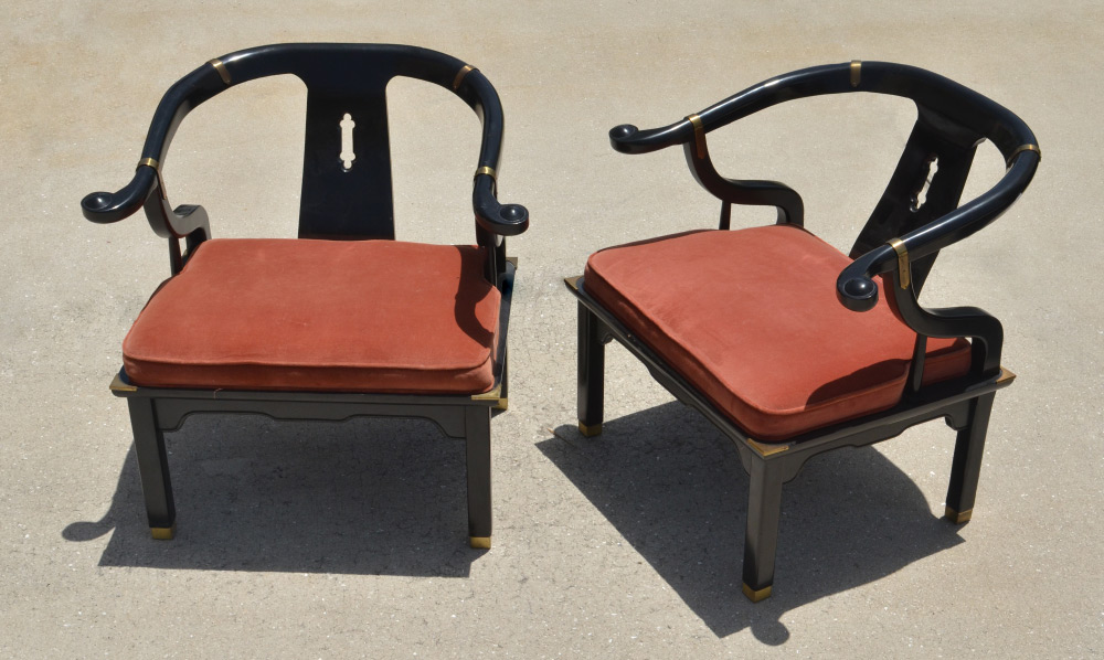 PAIR EBONIZED CHINESE HORSESHOE BACK ARM CHAIRS: 20th century production, horseshoe shape top rail and arms, shaped back splat with pierced decoration, shaped arm supports. Square legs, shaped skirt, brass accents, upholstered seat cushions. Overall measures 29 1/4'' h. x 31'' x 27''.