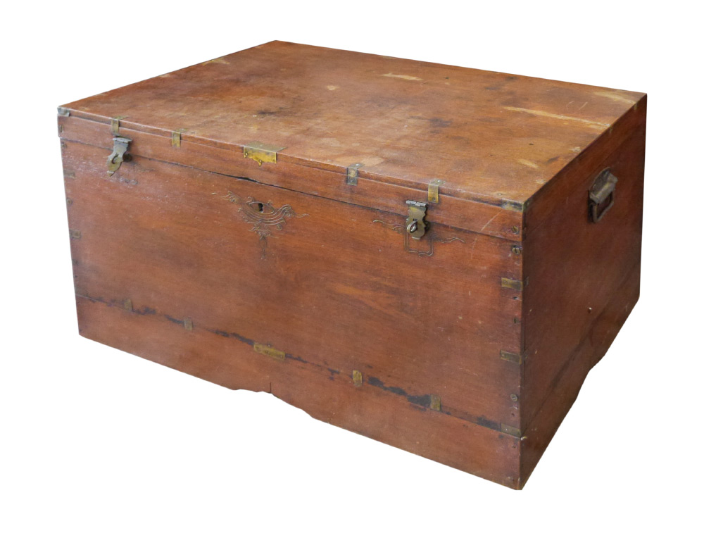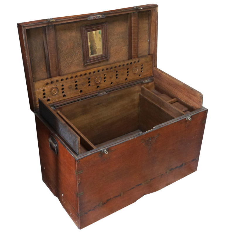 19TH CENTURY INDO-PERSIAN TRAVEL CHEST: Brass inlaid decoration at keyhole and front eyelets, brass joining straps on top and front. Inside of hinged lid with mirror and pierced carved decoration. 2 internal side boxes with carved lids, right side with hidden storage compartment, iron handles. Overall measures 21'' h. x 33 3/4'' x 19''.