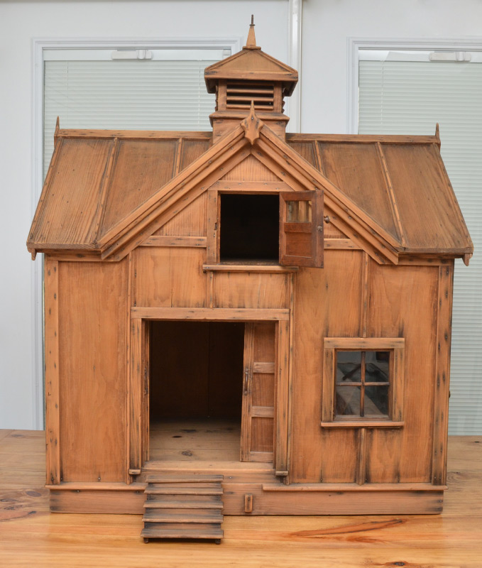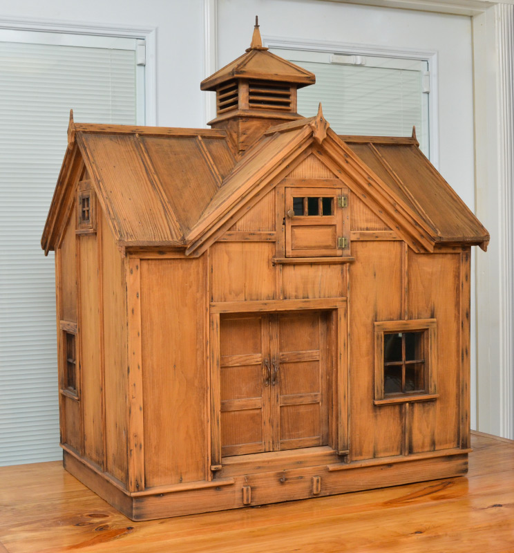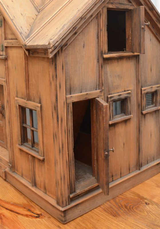 HANDMADE FOLK ART BARN MODEL: Nicely detailed model of a 2 story barn, fashioned from old barn wood. Lower level with sliding front door and hinged side door. Interior lower level with 2 horse stalls and stairs. Top level with 2 hinged external doors and hinged window, inside with 2 trap doors in floor. Nicely detailed cupola. Overall measures 39 1/2'' h. x 33 1/4'' x 22 1/4''.
