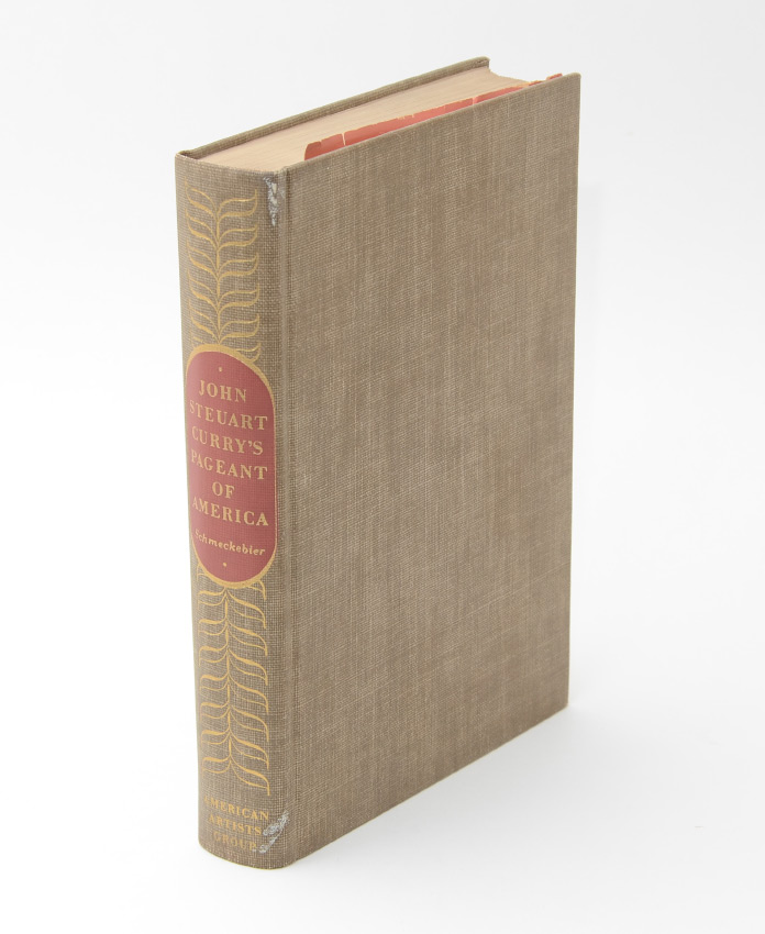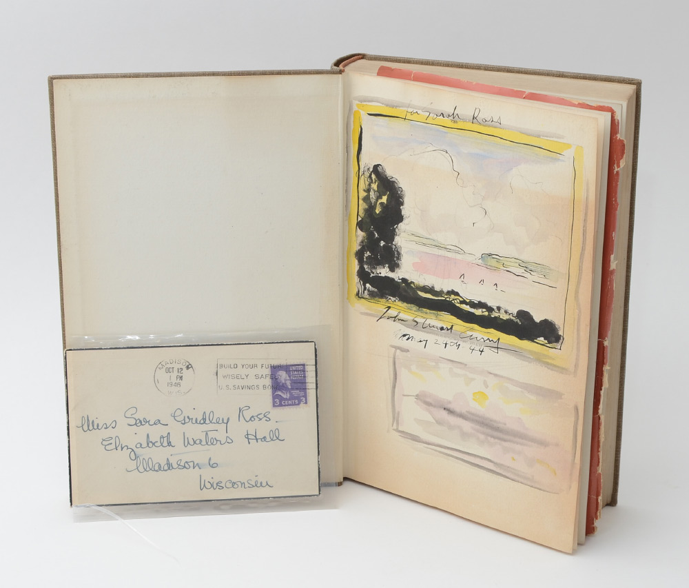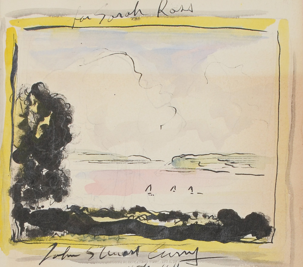 CURRY, John Steuart, (American, 1897-1946): Several Landscape Sketches Inside his Book ''John Steuart Curry's Pageant of America'', 2 drawings on 1 page are dated 1944, signed by Curry and dedicated to Sara Ross. Also included is a handwritten letter by Mrs. Curry to Sara Ross indicating that Mr. Curry and Ross worked together. 1st Sketch measures 4.5'' x 5'' and the 2nd measures 2'' x 4.5''. Curry attended the Art Institute of Chicago, and remained there for two years, supporting himself with odd jobs. He tried to enlist when war was declared but was sent home for being under-age. In 1918 he enrolled at Geneva College, played football for two seasons, and spent the following five years training to earn his money as an illustrator of ''blood-and-thunder'' scenes for a popular western story magazine. Curry set out to paint American subjects and to celebrate American patriotism and regional pride and committed to creating a worthwhile picture or give up painting. There in 1928 from memory he painted his first picture that became famous, Baptism in Kansas, which was recognized nationally as work of a new American genre. In 1930, he had his first one-man exhibition, held at the Whitney Studio Club, and was received enthusiastically by critics. Curry painted many murals for Washington's Government buildings, his work hangs in the Metropolitan Museum and he ranks with top United States artists. He has shown in the Whitney Museum of American Art and in the Chicago Art Institute.