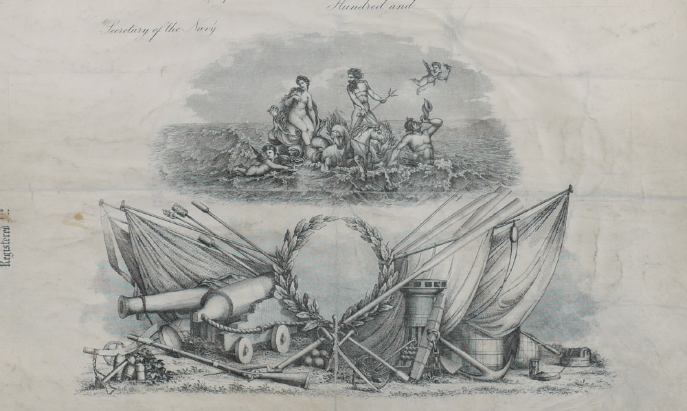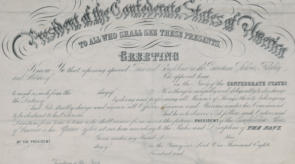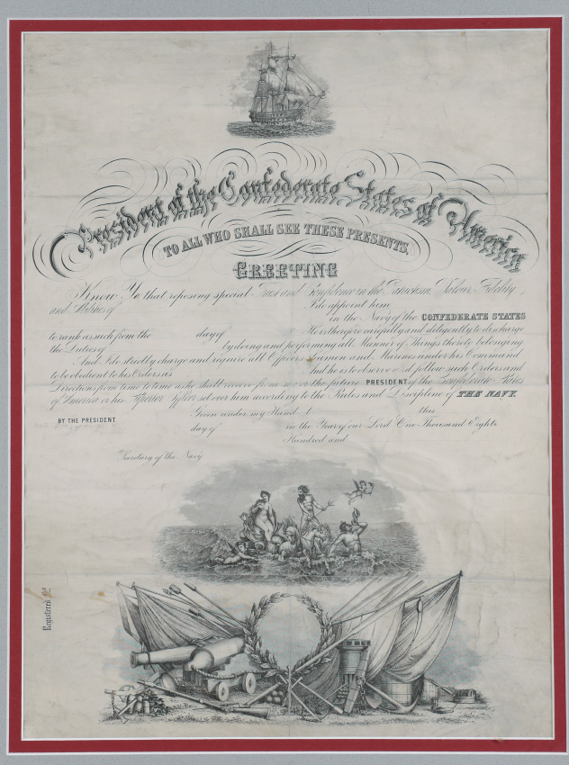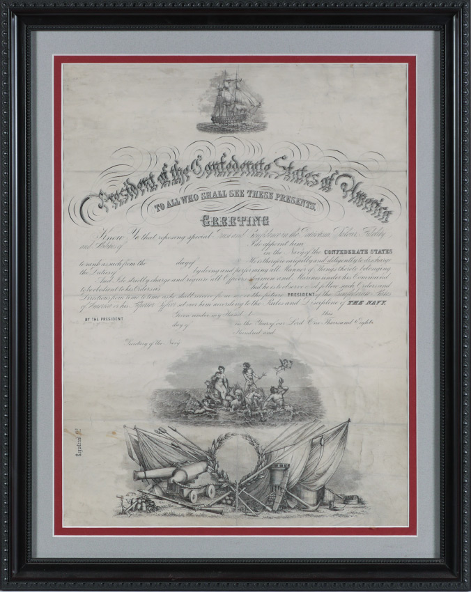 CIVIL WAR CONFEDERATE NAVAL COMMISSION: Blank commission issued by the President of The Confederate States of America with scenes of boats, Neptune and Venus, and stand of arms. Sight size 19 1/2'' x 14 1/2'', framed 25'' x 20''.