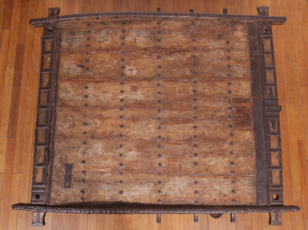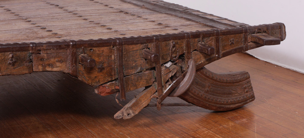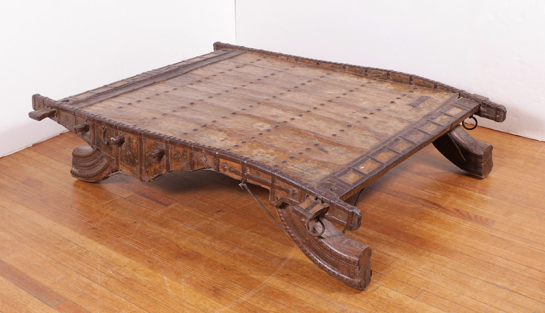OX CART COFFEE TABLE: Upcycled from the top of a vintage ox cart, wood & iron construction, overall measures 14 1/2''h. x 52'' x 64''.