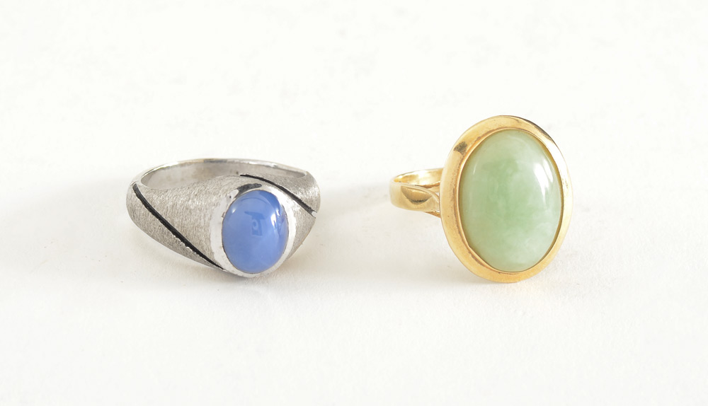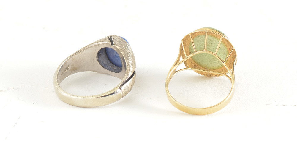 14K GOLD 2 RING LOT - LINDE STAR & JADE: 1) 14K White Gold with Synthetic ''Linde'' Star Sapphire. Size: 8.5. Weight 8.7 grams. 2) 14K Yellow Gold Ring with 16.00 x 12.00 mm oval Jade cabochon, light apple green with heavy mottling and veining. Size 7. Weight: 3.9 grams. Sold as a lot.