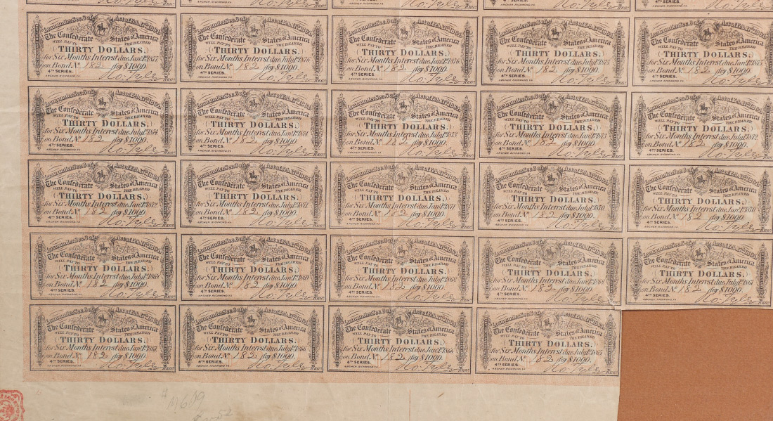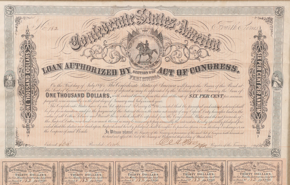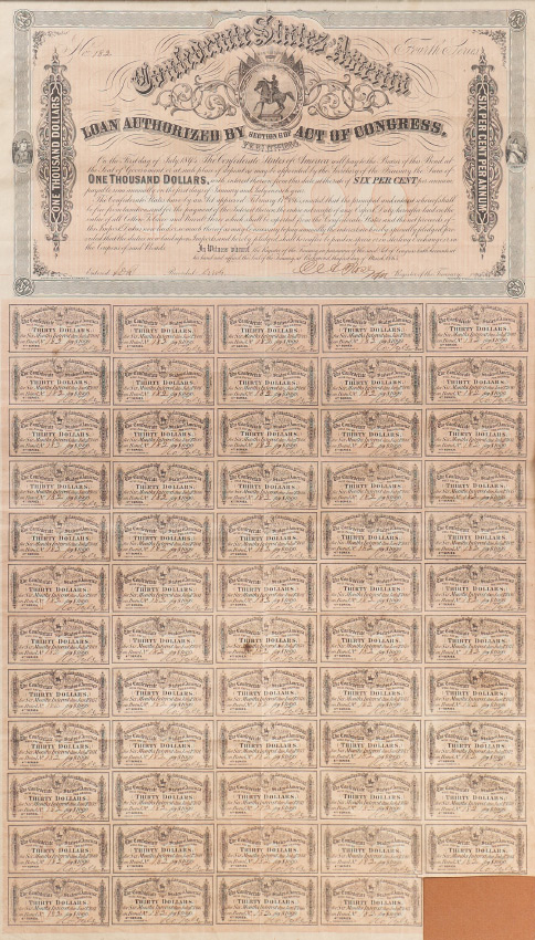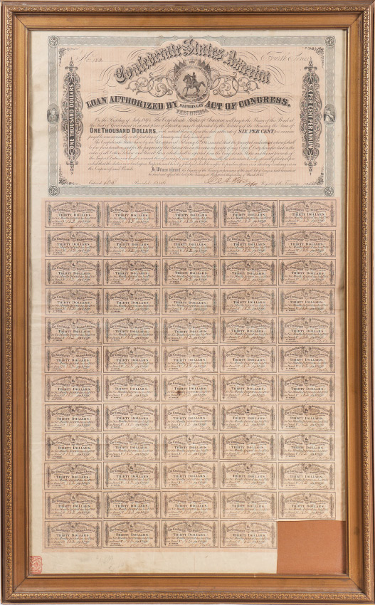 $1000 CONFEDERATE STATES CIVIL WAR BOND: Fourth series, 1864 with 59 coupons remaining, sight size 27 1/4'' x 16 1/4''. Framed 30 1/2'' x 19 1/4''.