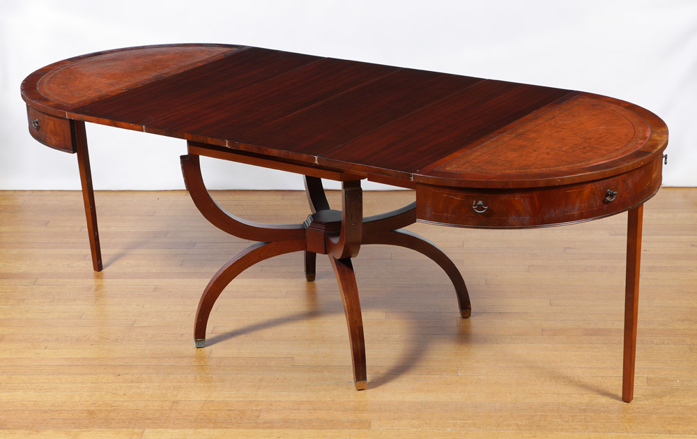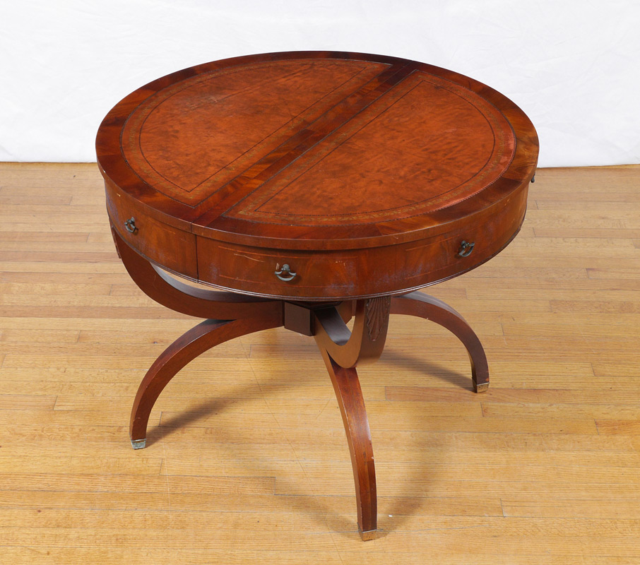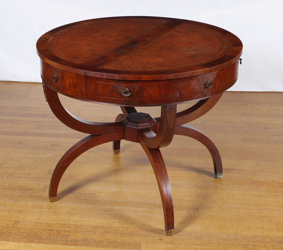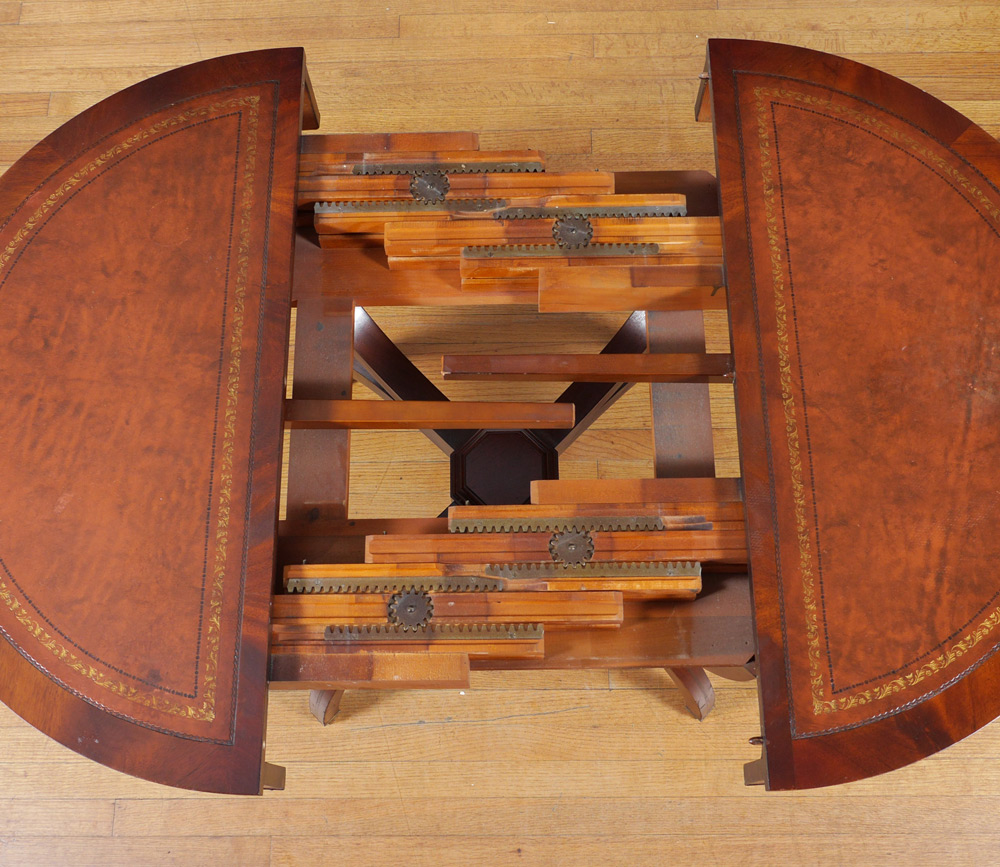 LEATHER TOP EXPANDABLE DINING TABLE: Embossed leather inset in the round top, 4 x-shaped splayed legs, expands with four 12'' leaves, 29 3/4'' h. x 36'' when closed.